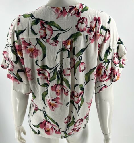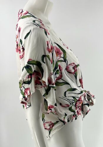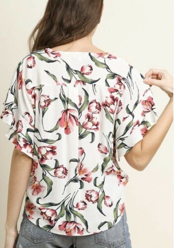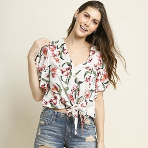 Umgee Cropped Tie Front Top Floral White Pink Boho Blouse Ruffle Sleeve NEW