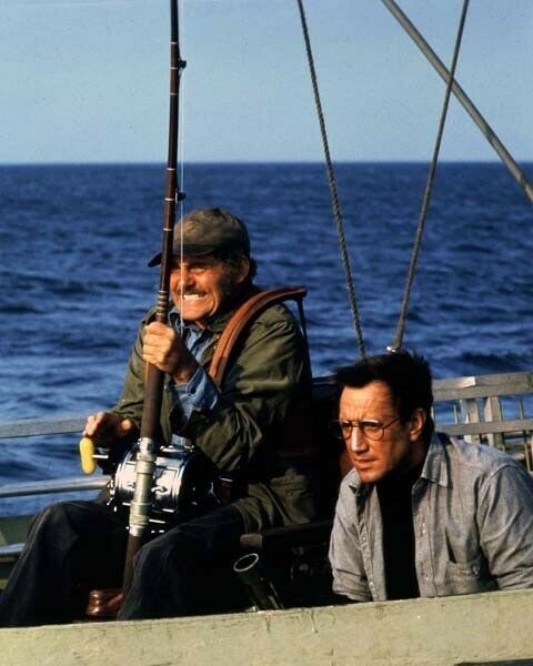 Jaws Robert Shaw reels in shark oboard Orca Roy Scheider looks on 8x10 photo