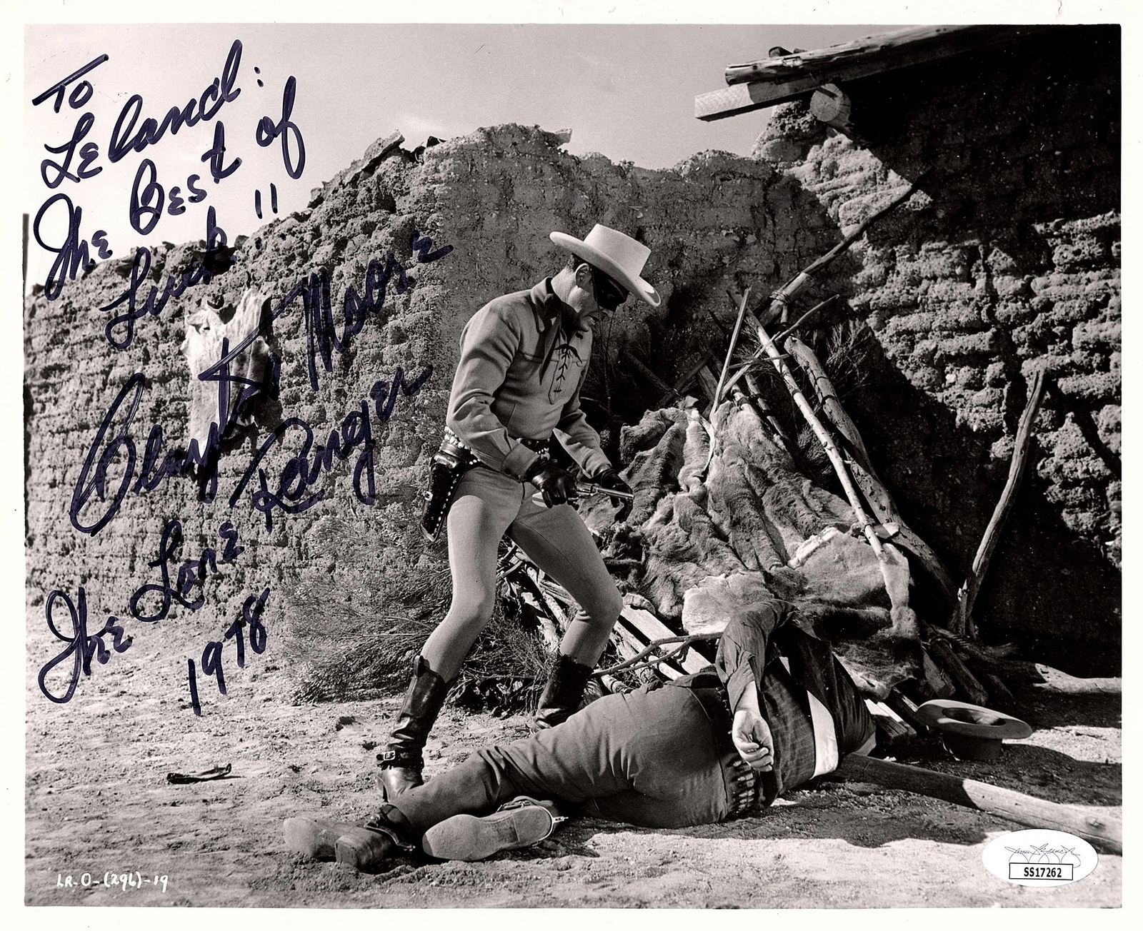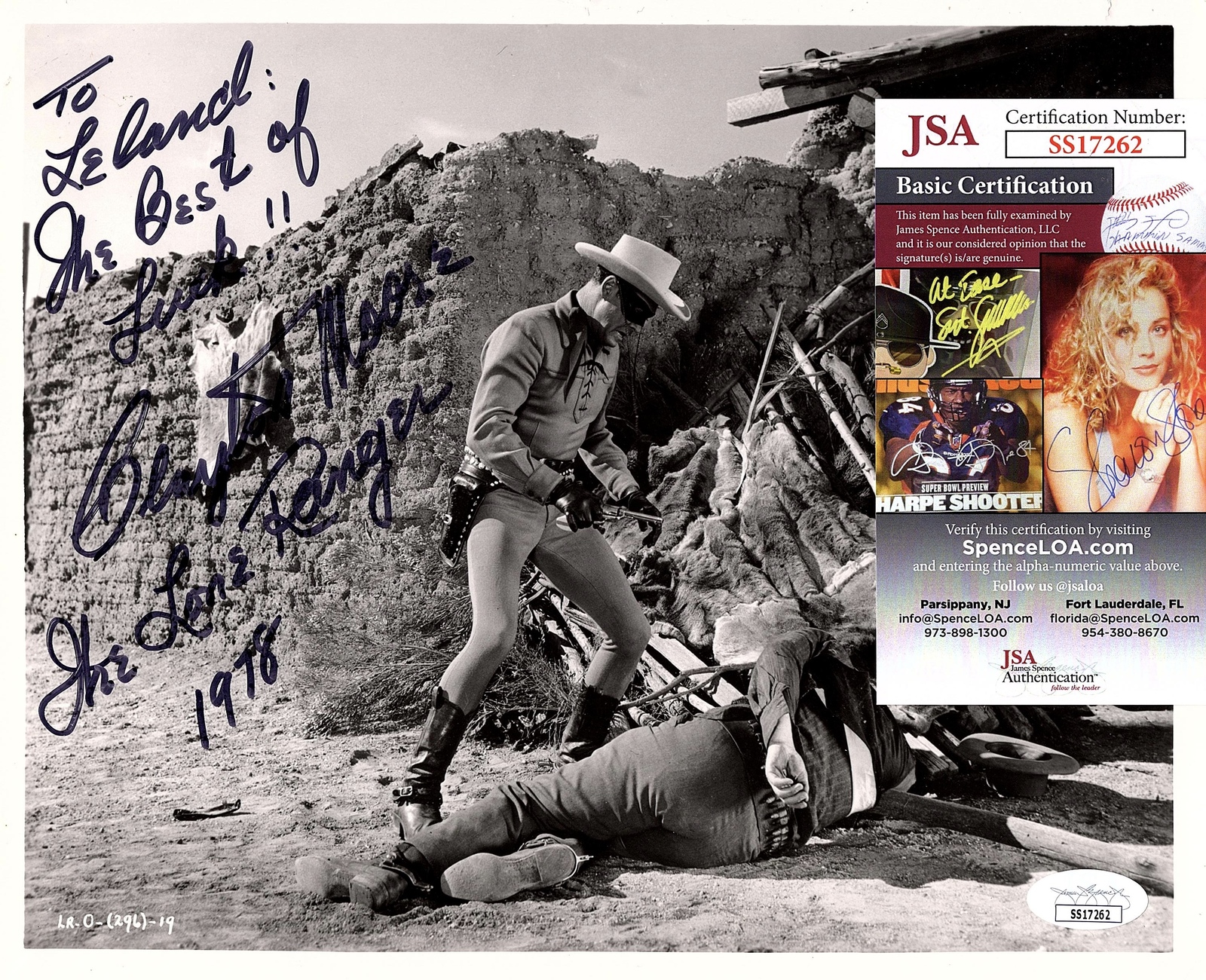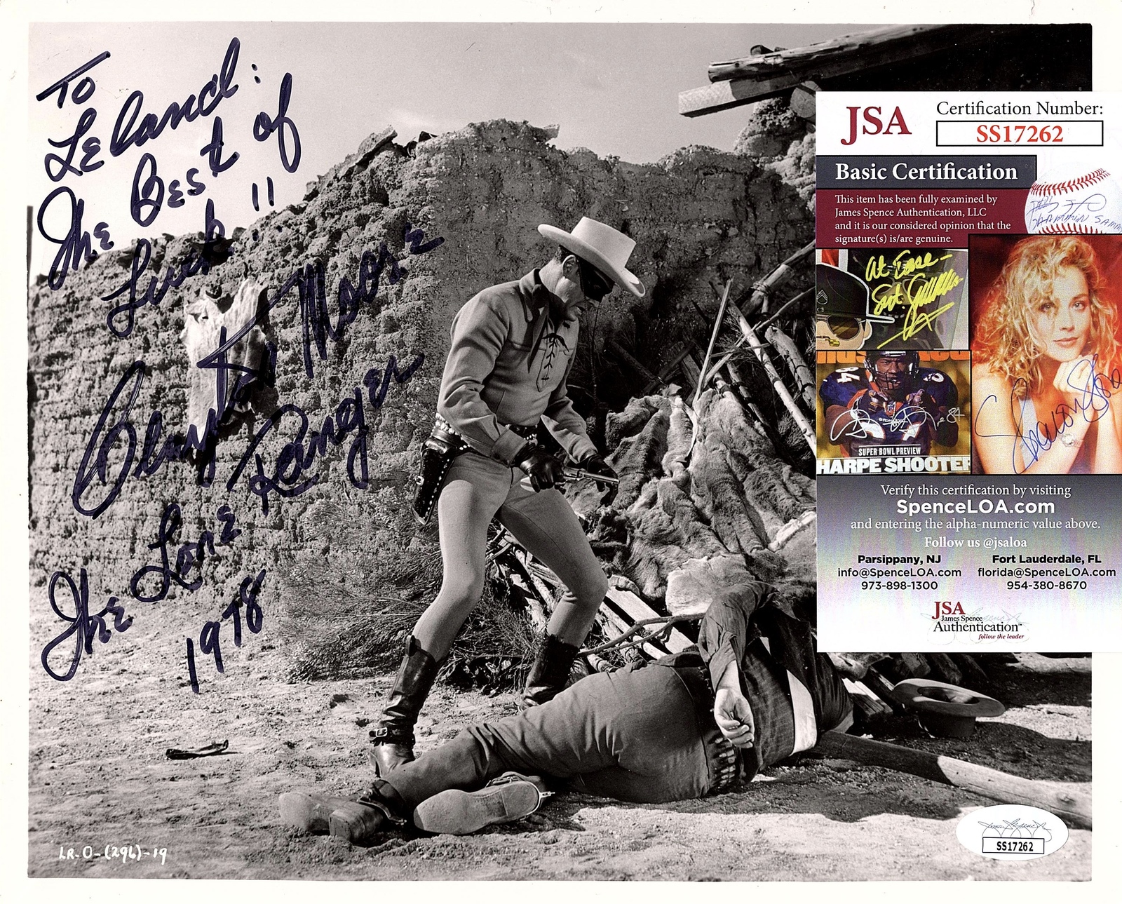 Clayton Moore "The Lone Ranger" autographed vintage 8" x 10" photo hand signed in black felt tip marker and inscribed To Leland The Best of Luck !! Clayton Moore The Lone Ranger 1978. This signature has been authenticated by JSA James Spence authentication Certification Number: SS17262 and will come with the matching cert card you see in the scan. The photo has a small tear in the top white border with minor creasing in the borders and is vintage. This photo will come in a clear hard top load for display. Buy with confidence we have been selling in-person autographs since 1992. TV Shows