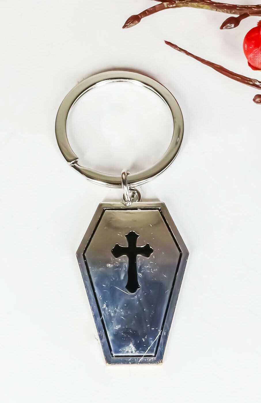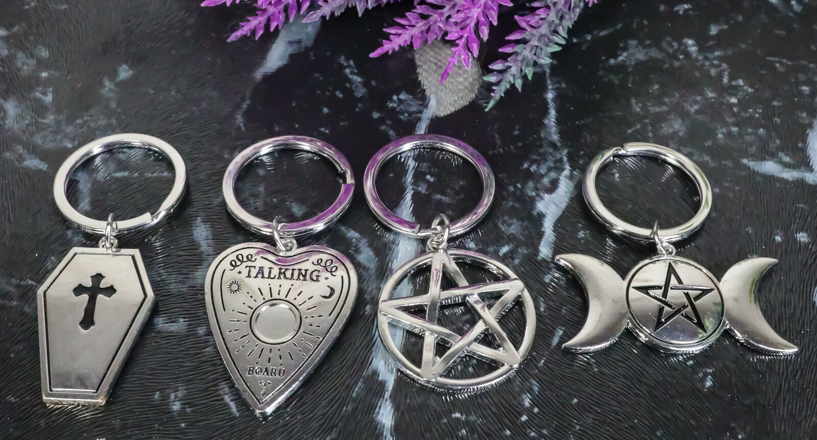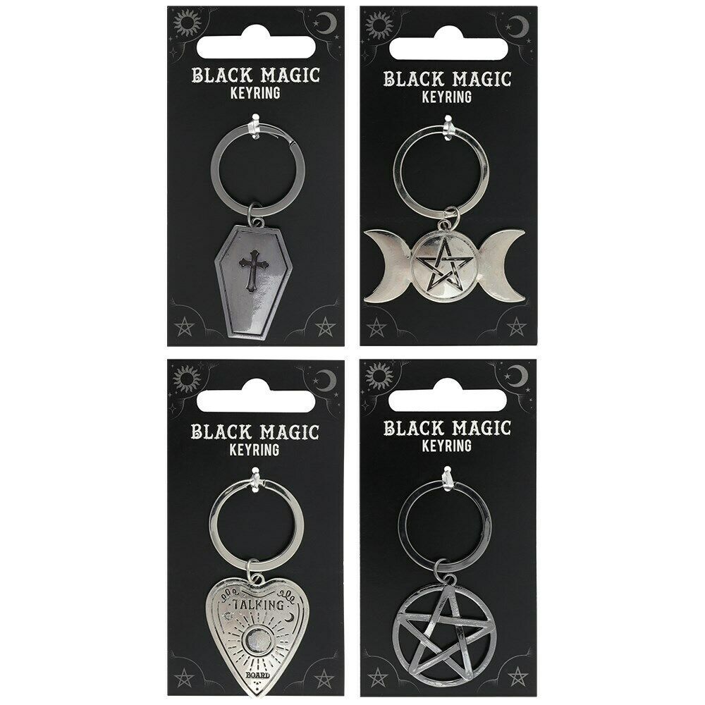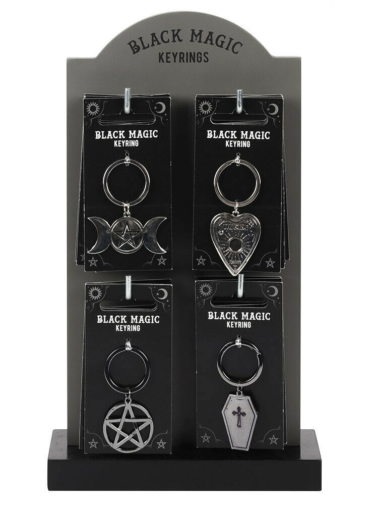 • Exclusively designed as part of our Black Magic collection, we present to you 4 eclectic wiccan symbolic keychains styles. Made of polished engraved metal, our high quality keychains feature the Talking Board Planchette Heart Shape, Triple Moon With Pentagram, Pentagram Circle and Coffin with symbol of the Cross. Our unique display stand is made of MDF wood and is designed to resemble a graveyard tombstone.