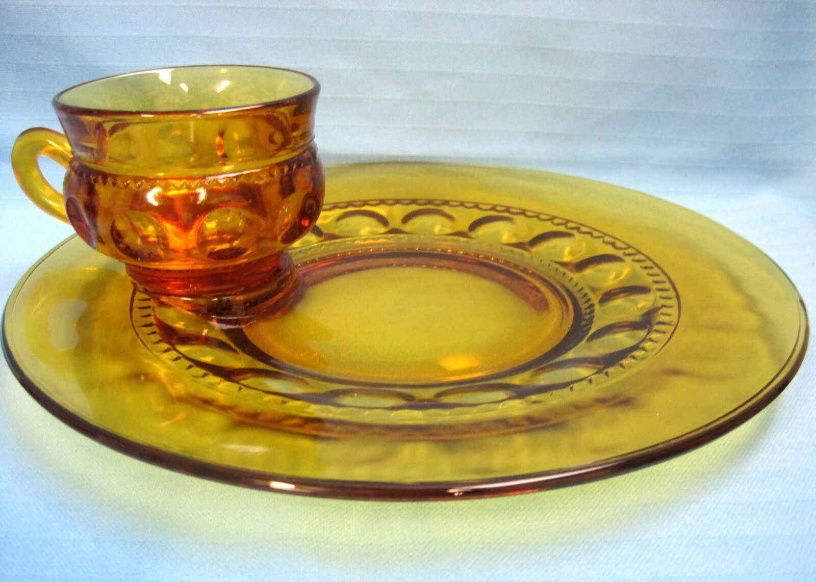 Indiana Kings Crown Thumb Print Amber Depression Glass Snack Set 3 Plates Cups X
