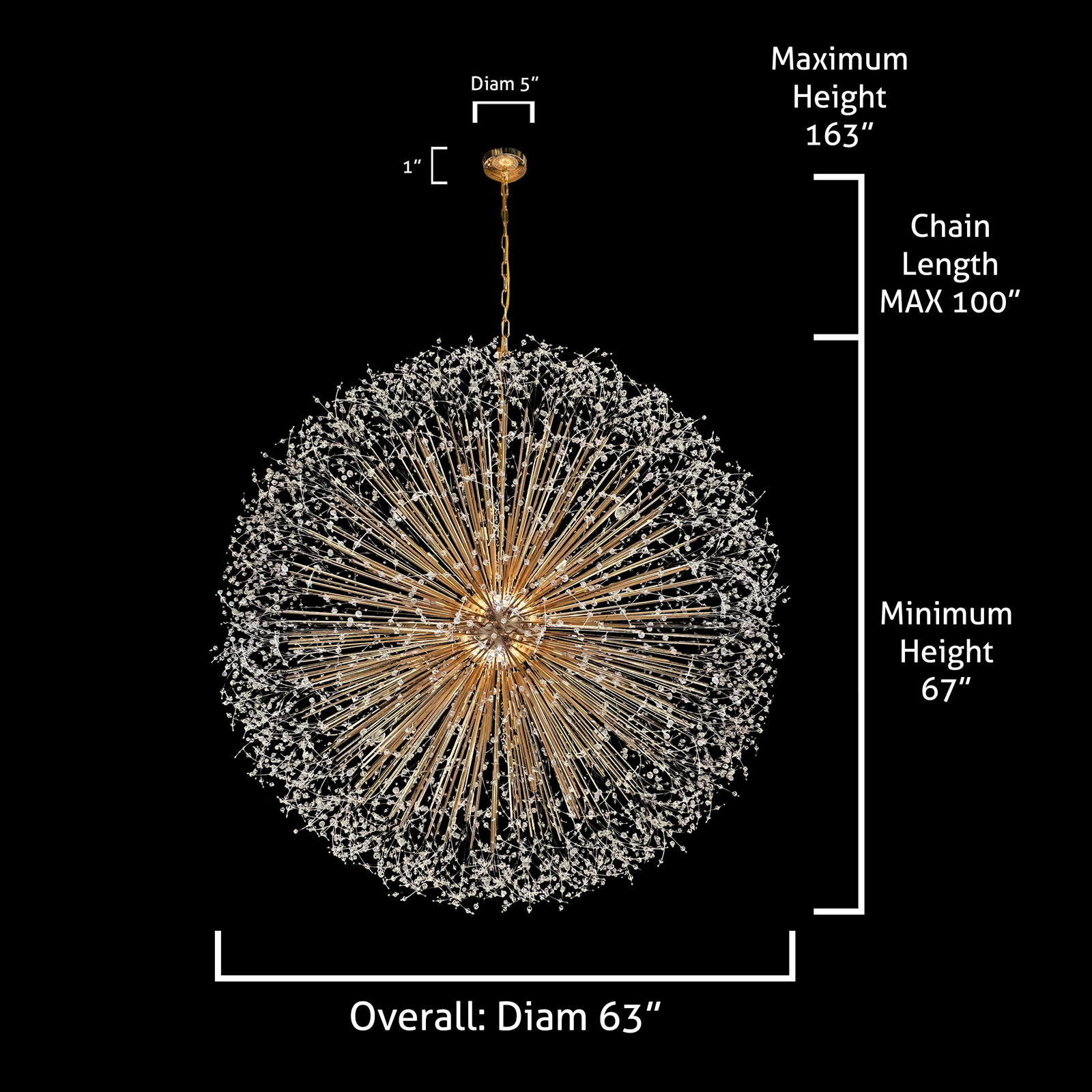 - Chandelier dimension : The fixed size is 63" high X 63" in diameter. Need 30 light bulbs (bulbs not included) kind of the light bulbs G4 or G5.3, Max wattage: 20W , Voltage 110V Make sure 110V Not 12V