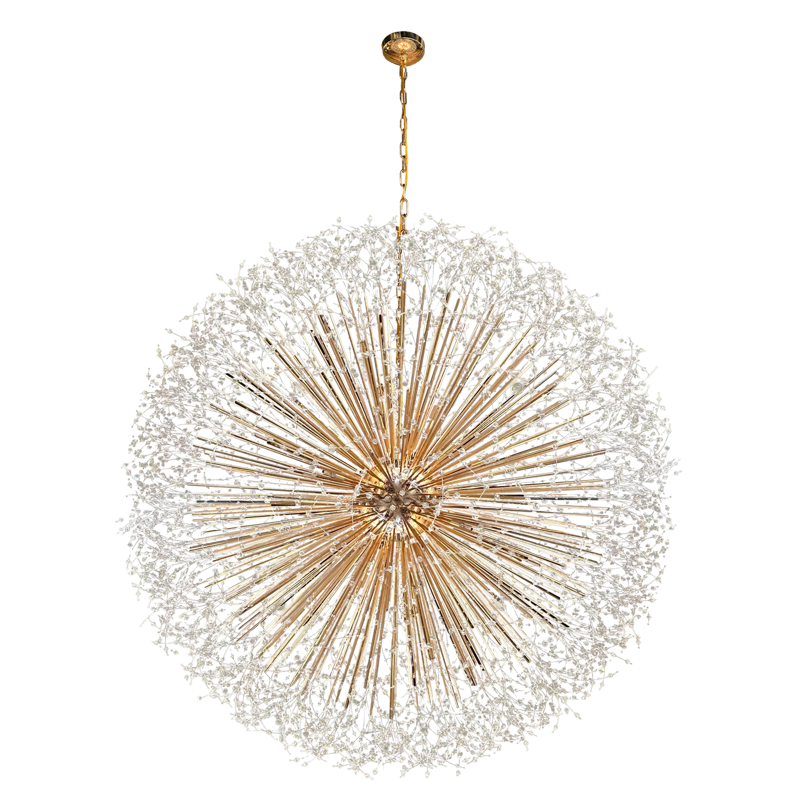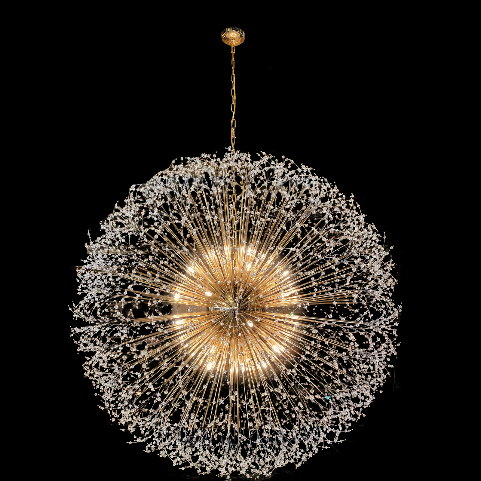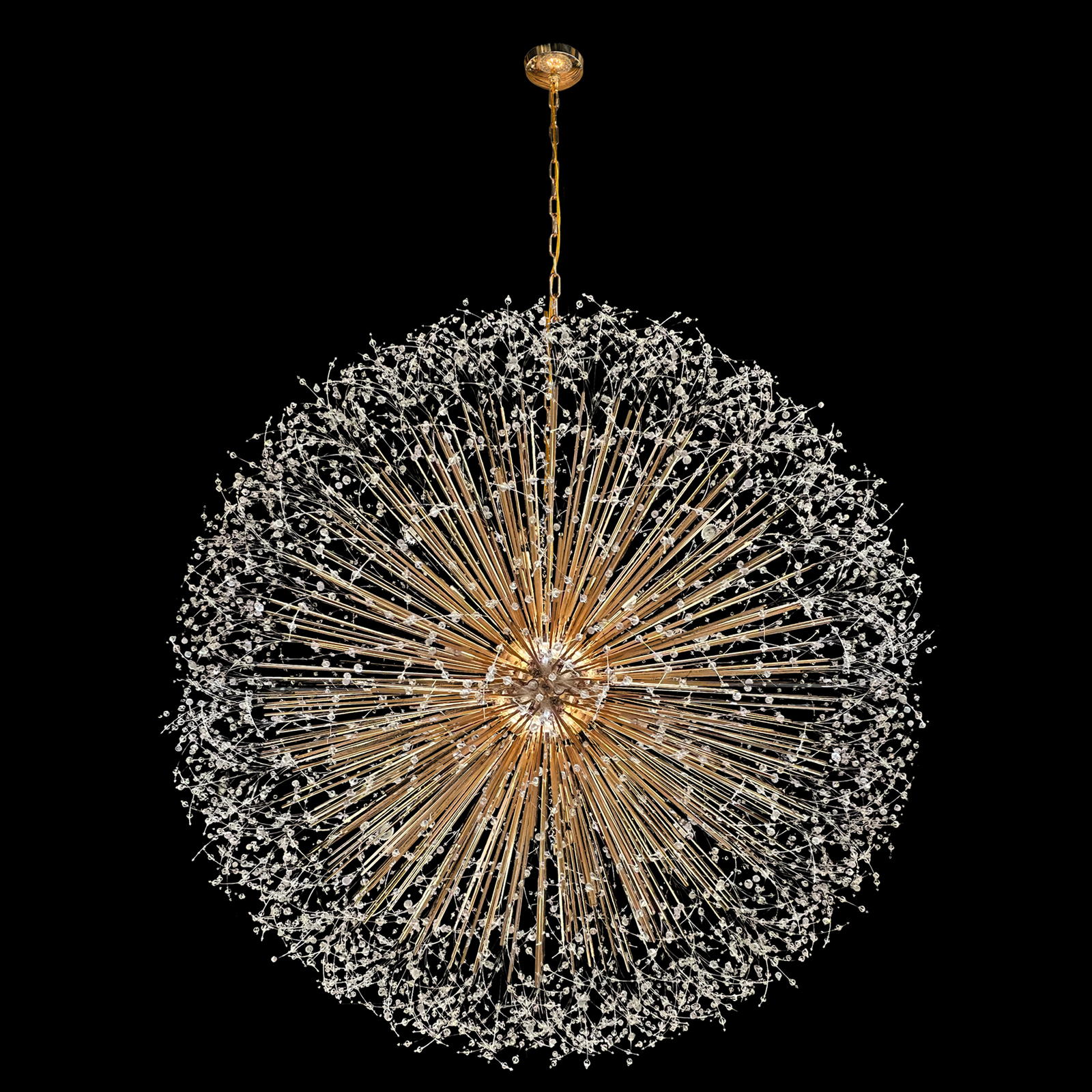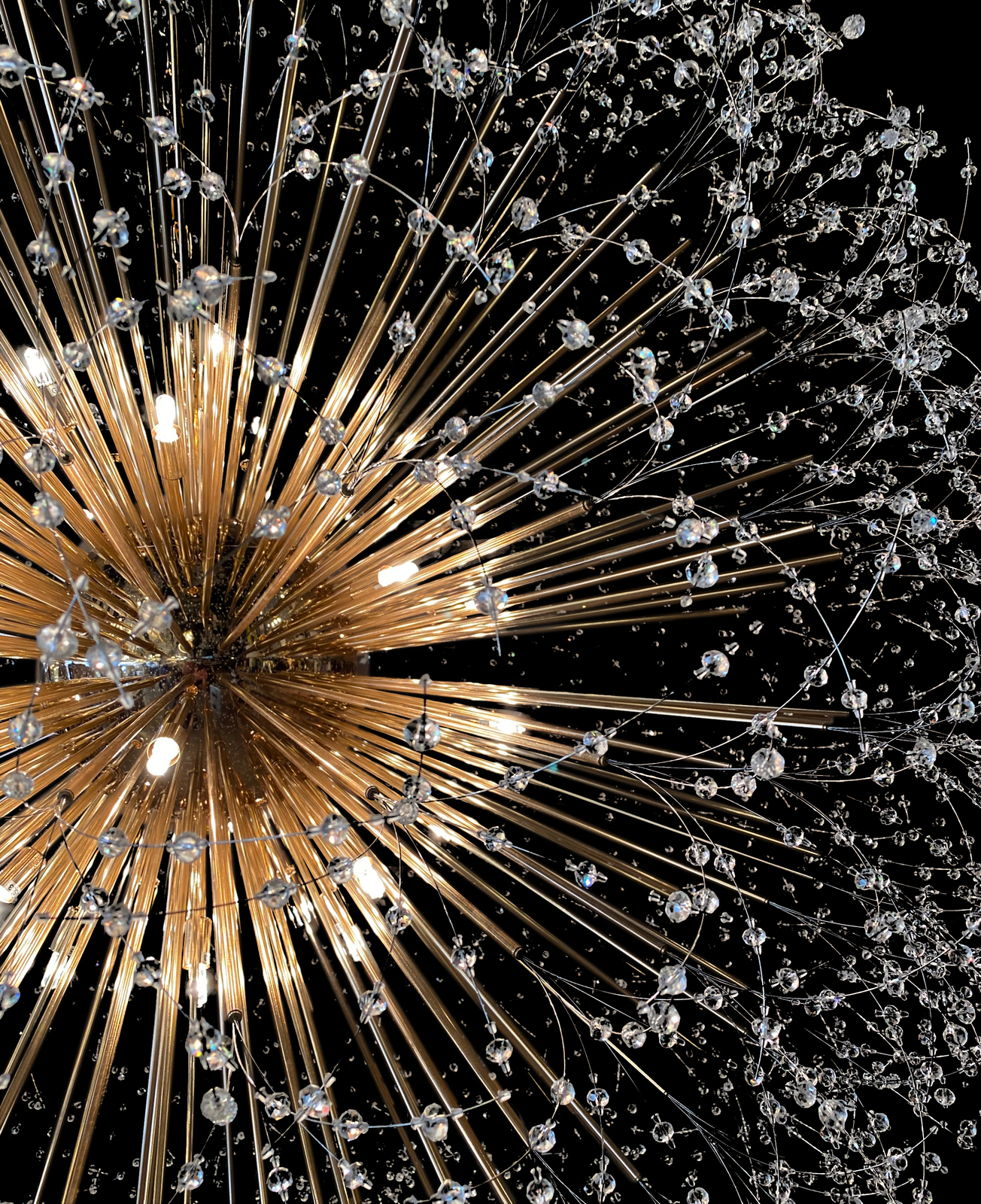 - this chandelier is filled with a high density of crystal and golden tubes, designed by the best lighting engineers in the United States of America This chandelier is like a shining planet in the sky, We designed the bulbs in a very small size and with incandescent lights to suit the design, The pictures will not reflect to you how beautiful this chandelier is, it will be completely different in your home .