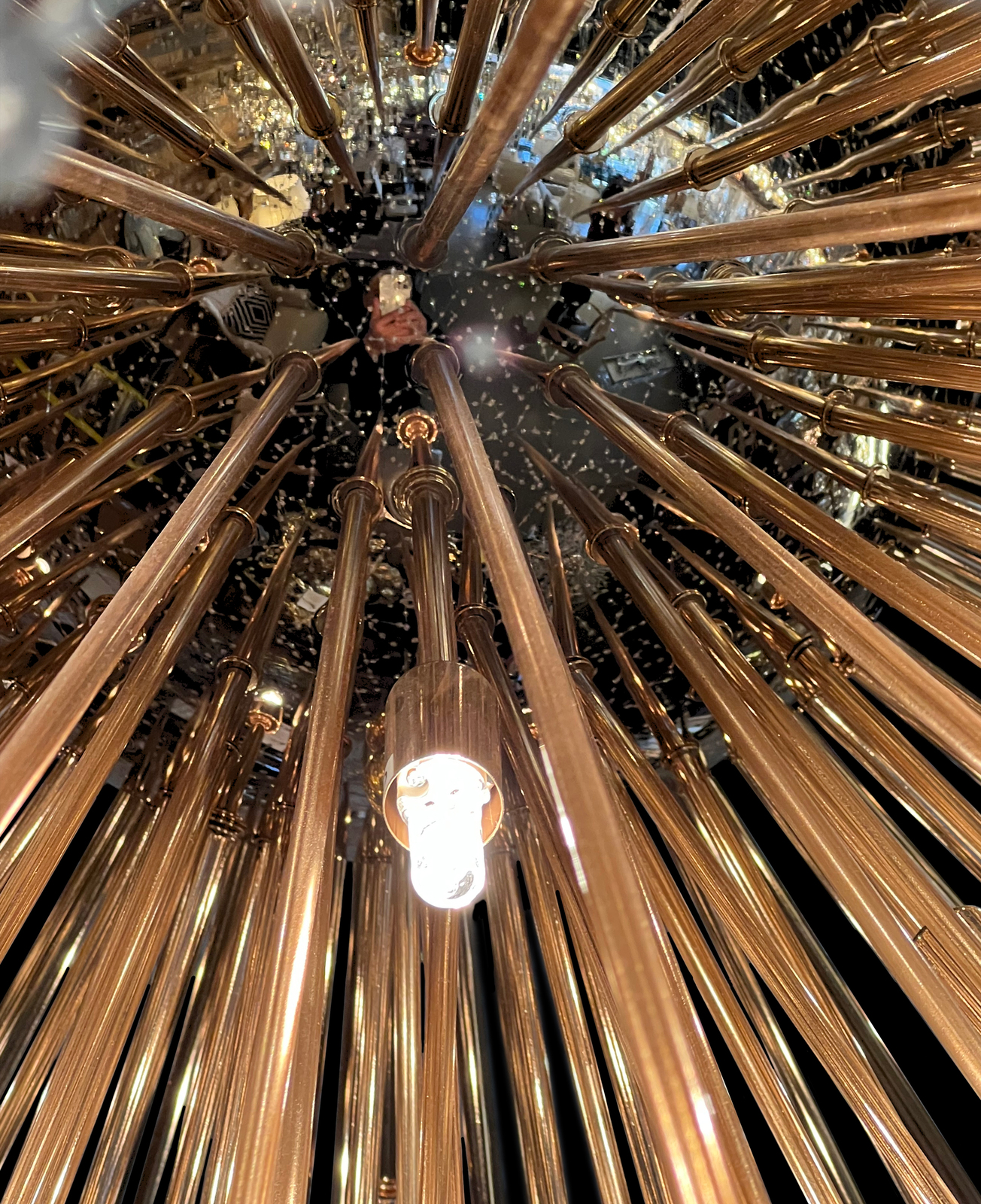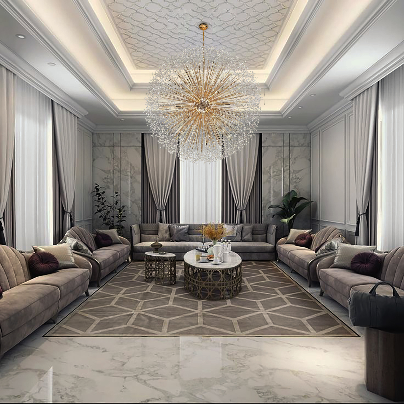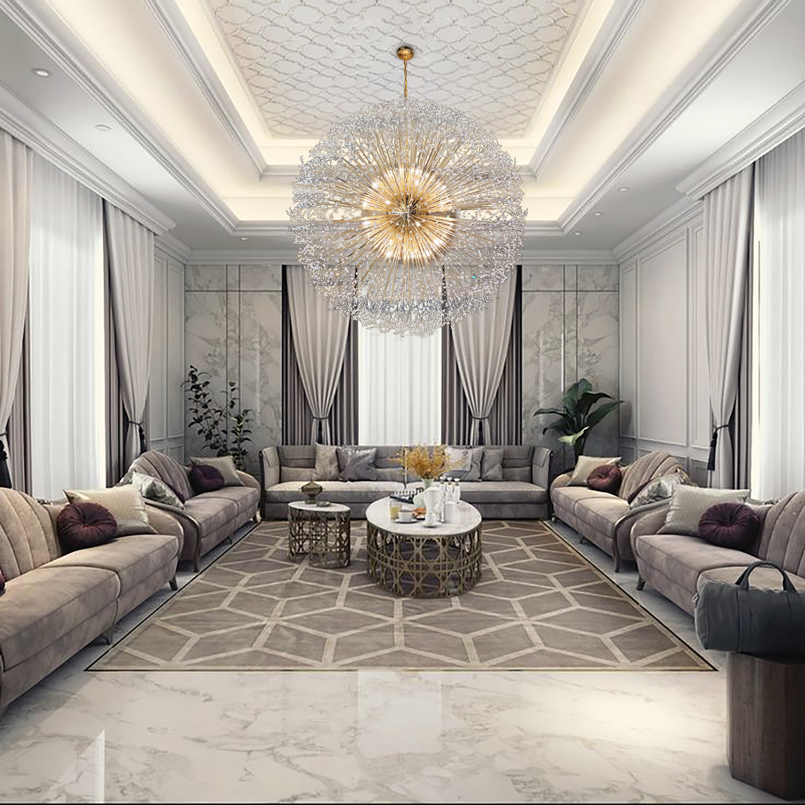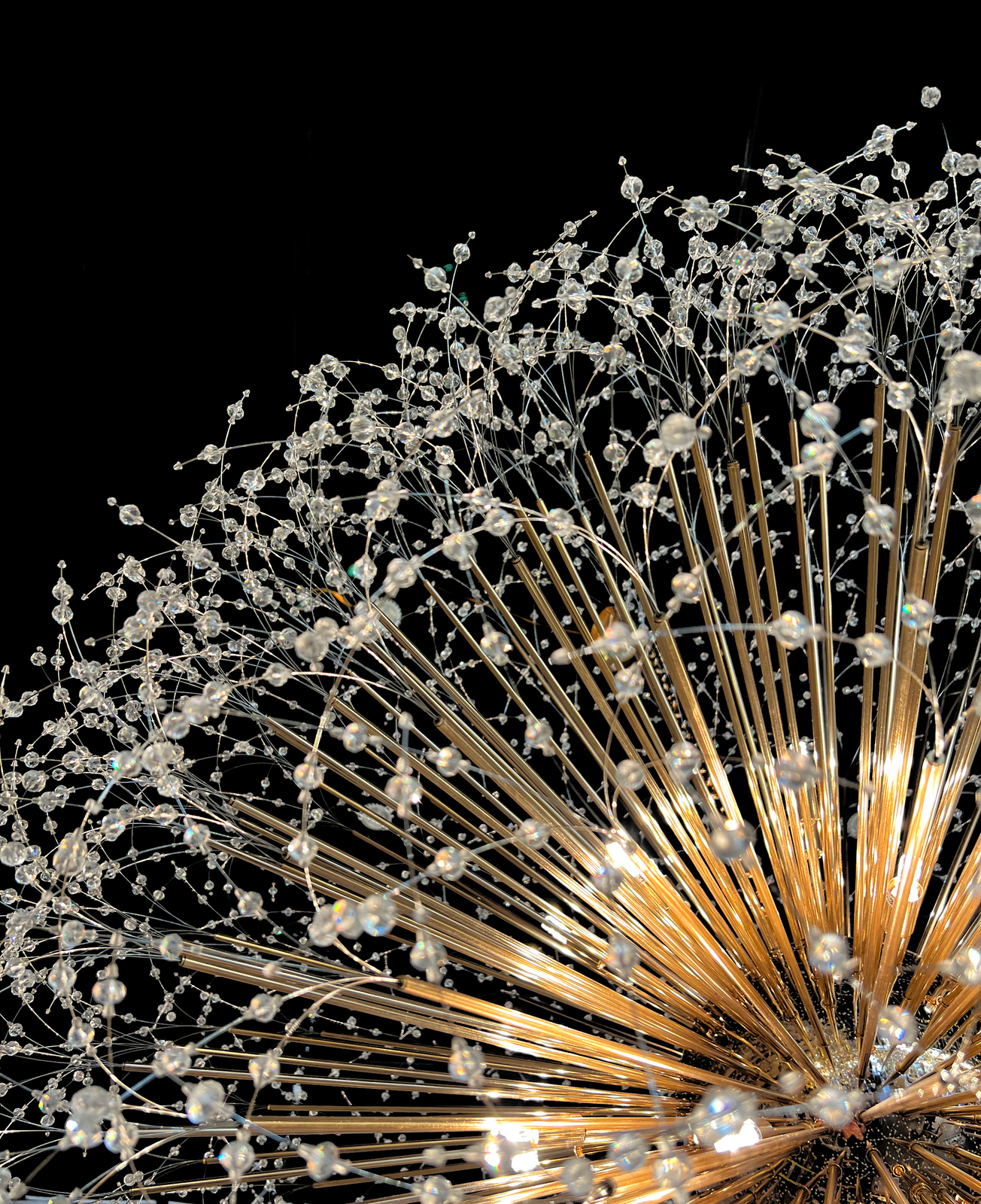 - this chandelier is filled with a high density of crystal and golden tubes, designed by the best lighting engineers in the United States of America This chandelier is like a shining planet in the sky, We designed the bulbs in a very small size and with incandescent lights to suit the design, The pictures will not reflect to you how beautiful this chandelier is, it will be completely different in your home .