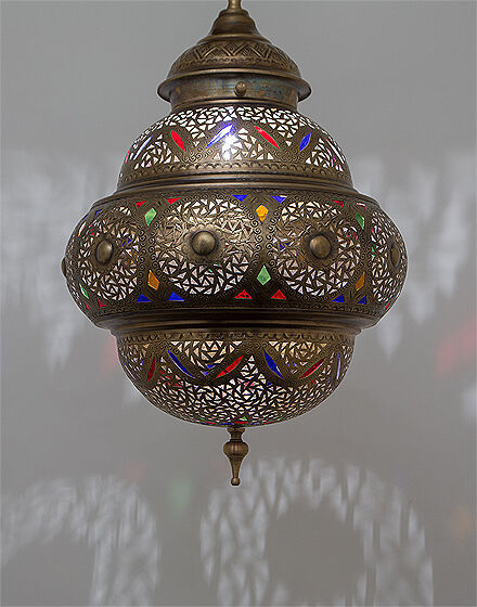Antique Brass Moroccan Pendant Lamp with Coloured Glass Inserts