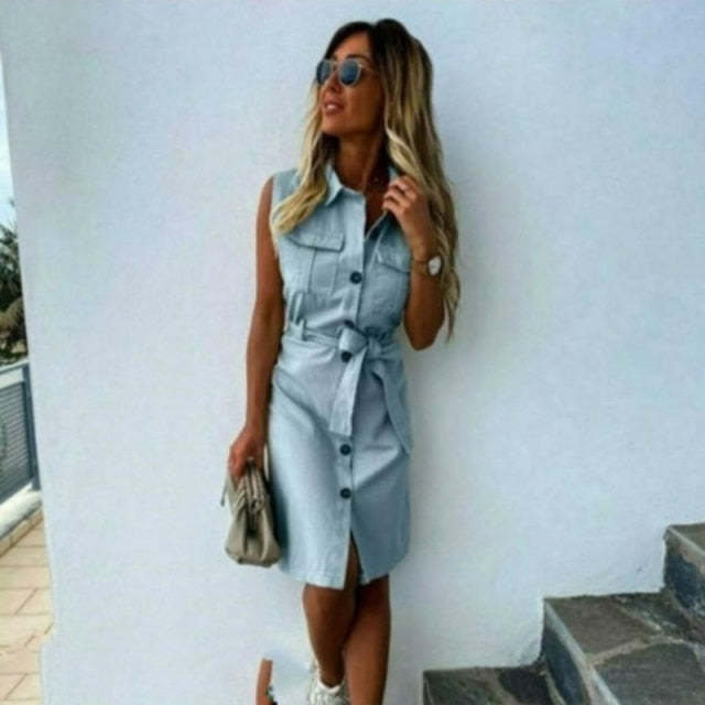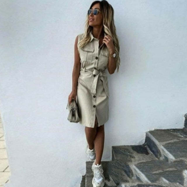 Vintage Front Button Sleeveless Turn Down Collar Sashes Sheath Dress
