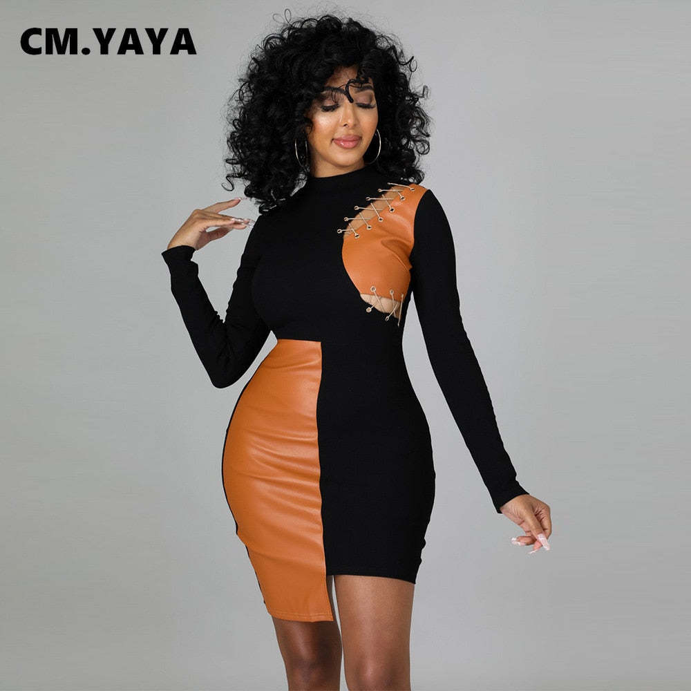 Patchwork Faux Leather Long Sleeve Lace Up Irregular Dress