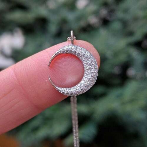 14k White Gold Over 1.30Ct Round Cut Diamond Crescent Moon Pendant 18" Necklace