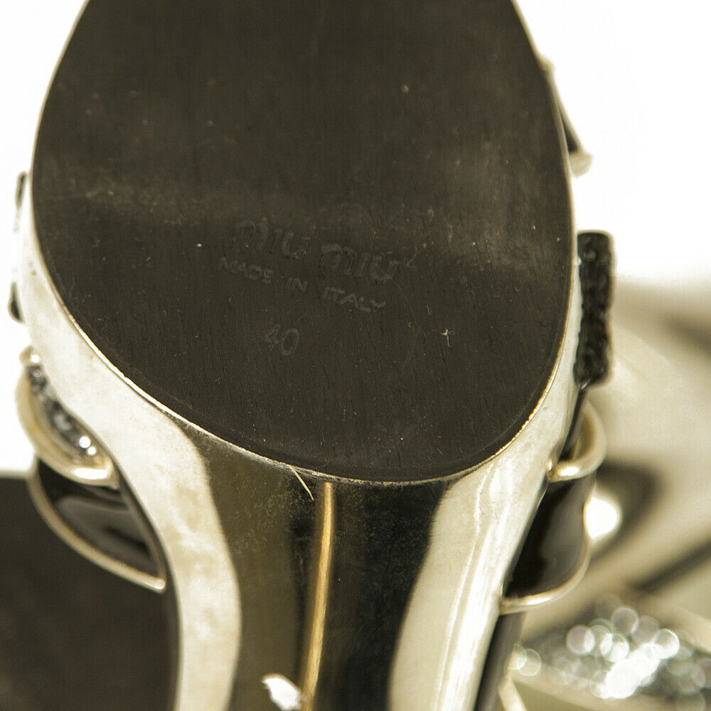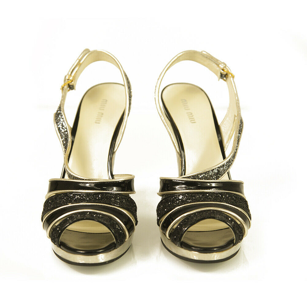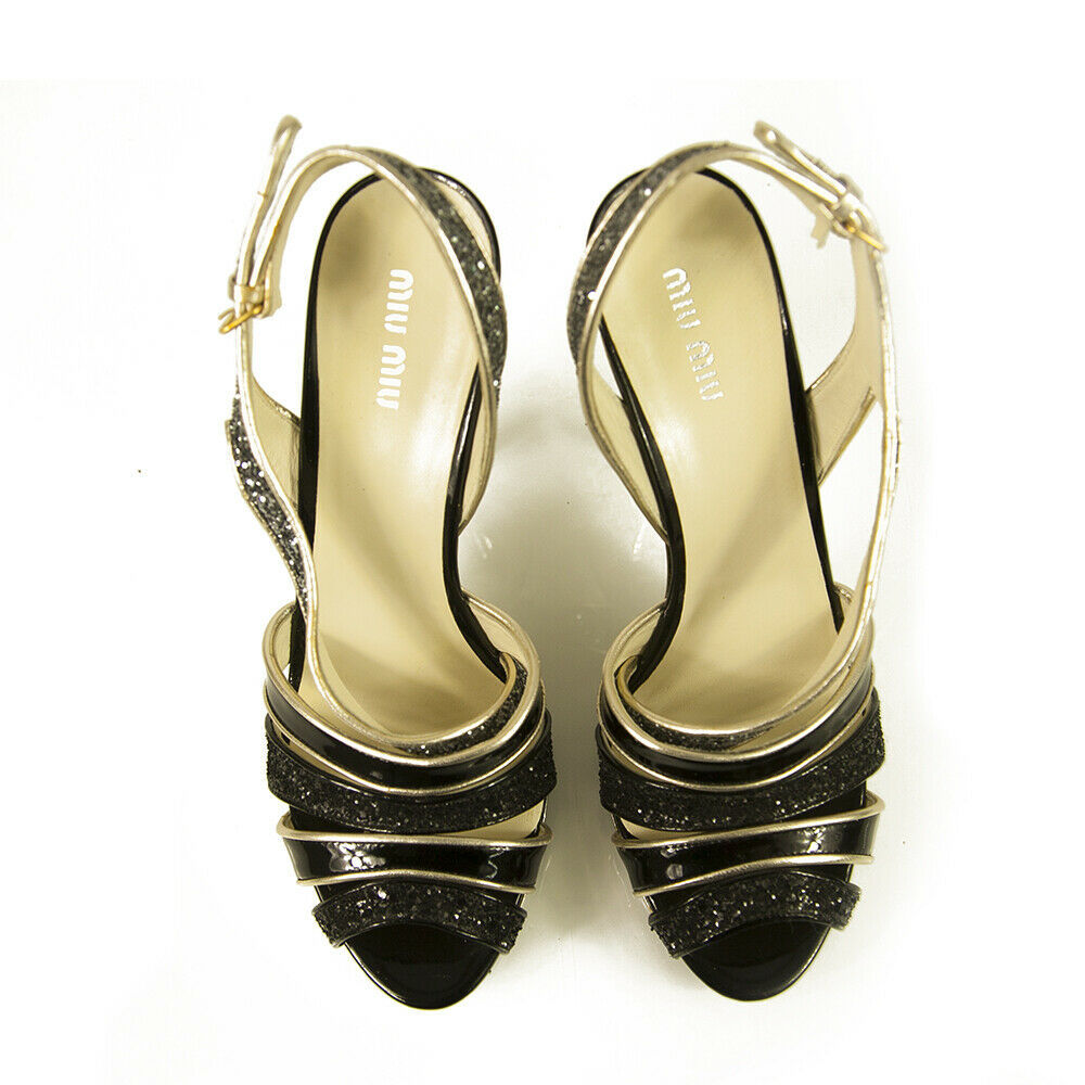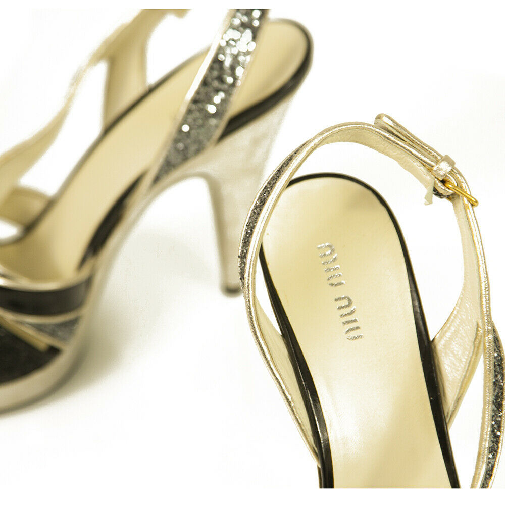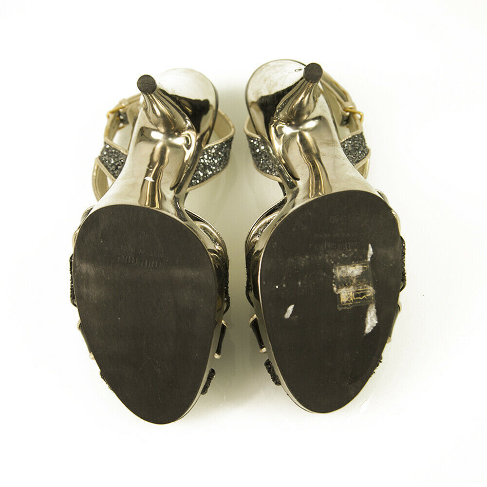 Miu Miu Black Glitter Gold Tone Trim Silver High Heel Strappy Sandals Shoes 40