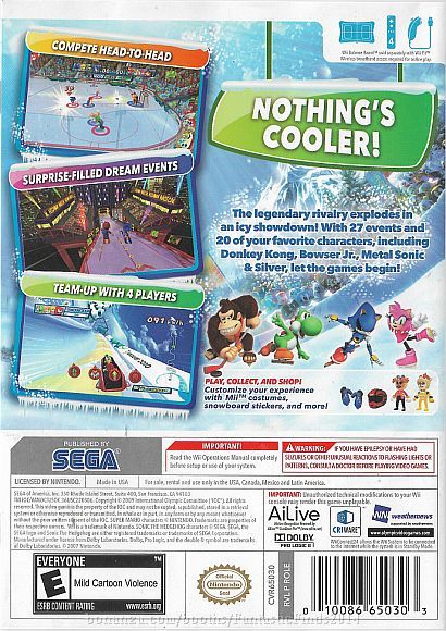 Plot: Mario Sonic at the Olympic Winter Games is a sports party game that takes players on the Wii platform to Vancouver, Canada, host city of the official 2010 Olympic Winter Games. This gaming experience invites players of all ages and skill sets to face-off in intense winter competitions in lifelike Olympic venues where they can choose from a legendary cast of playable characters, including new faces to the series like Donkey Kong, Metal Sonic, Bowser Jr., and Silver. The game features intuitive controls, multiplayer modes and Wii Balance Board functionality allowing for a more interactive and realistic gaming experience. Shopping options throughout the game's Olympic village provide opportunity to buy both the gear and upgrades needed for competitions and to customize the gear that you already have. 022622-022622P-VG1