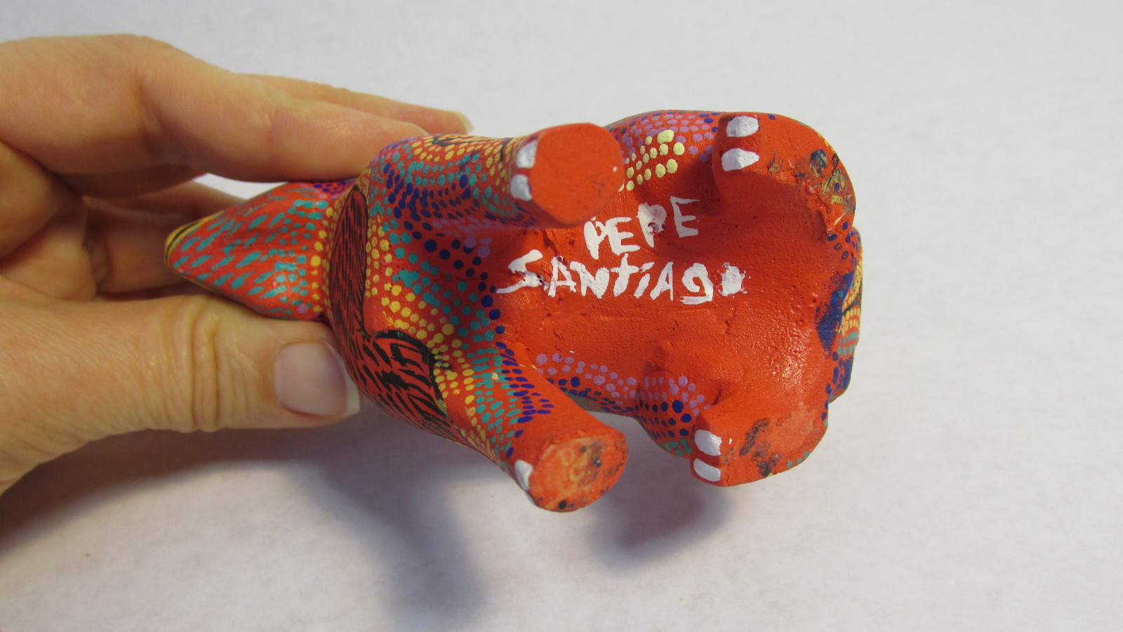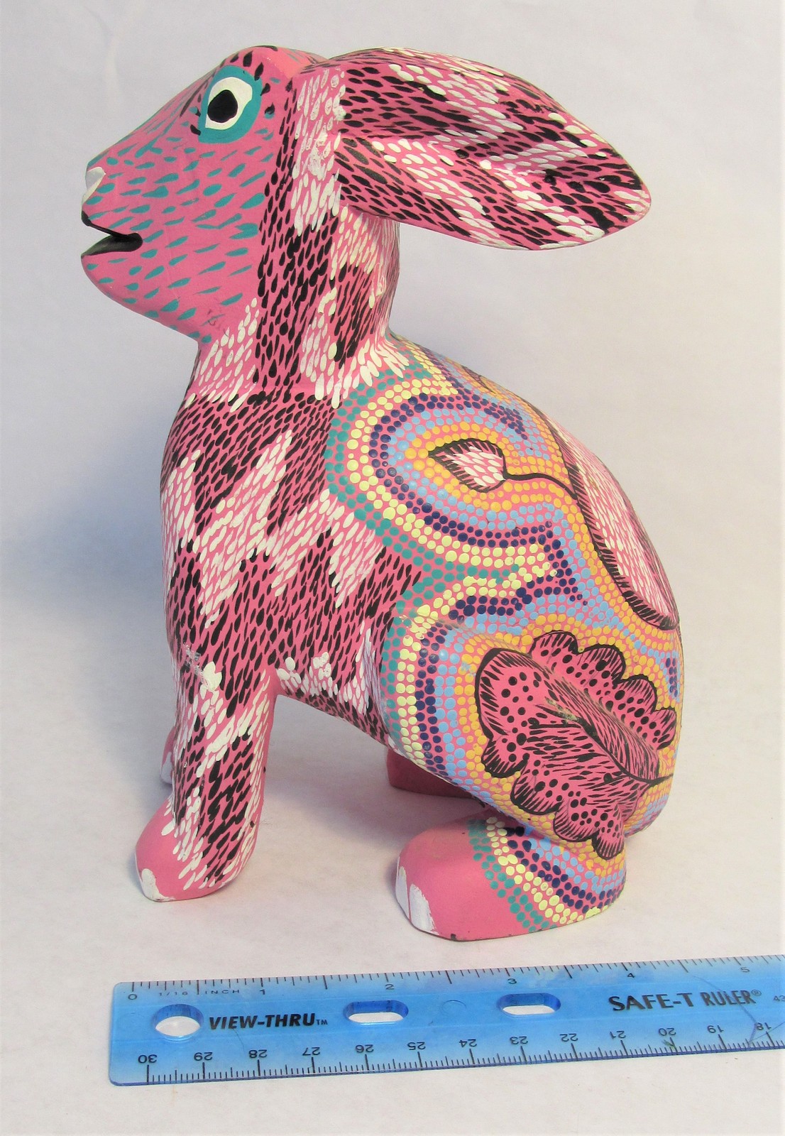 This set of two alebrije rabbits was handmade by one of the older generation of this relatively new, but wildly popular style. José (Pepe) Santiago Ibañez is from San Antonio Arrazola, in the state of Oaxaca, Mexico. He and his family have made a tradition of these beautiful copal wood carvings with amazingly detailed, hand painted designs. The rabbit's colors do not match exactly so they are probably from different dates which the sellers did not provide. Please look at the photos carefully to view the obvious damage from age of chips and cracks on both of them. These creations are known as folk art, but each one is unique. The larger one is about 7" tall by 5" long by 4"wide. The smaller one is about 3 and 1/2" tall and long and 1" wide. Let me know if you have any questions.