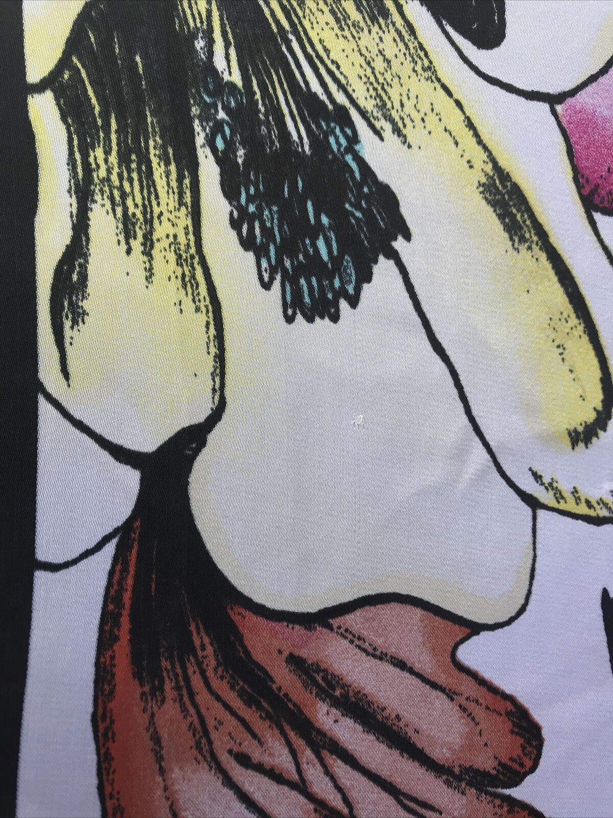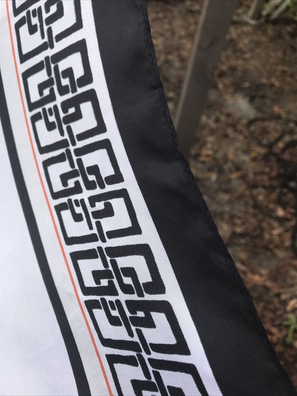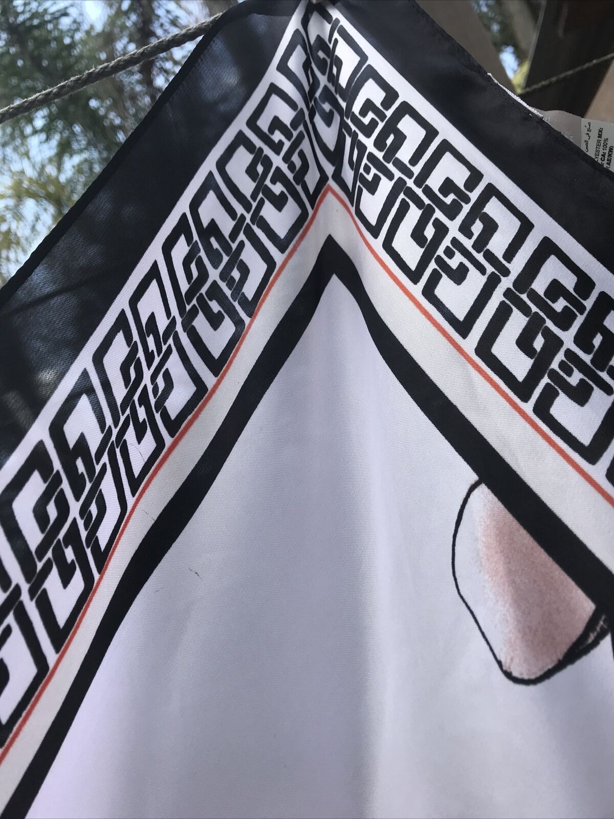 New with tag attached: see multiple up-close outdoor photos, both sides (few sporadic factory color imperfections, noticed within black of Greek key style border; 1 subtle snag run within yellow of flower touching side border plus few other beige grime rubs, not too noticeable as somewhat blend in but there shown up close ~ some wrinkles from closet kept storage). No bad odors/smoke-free home.