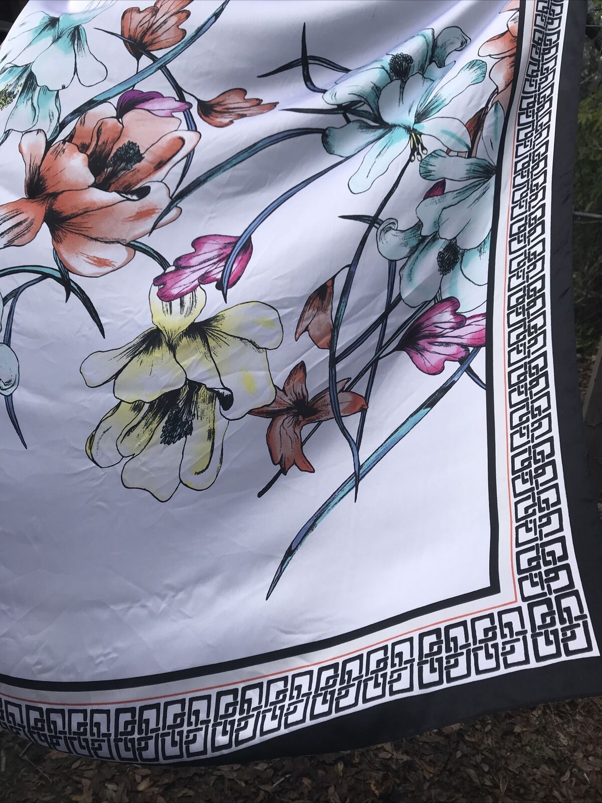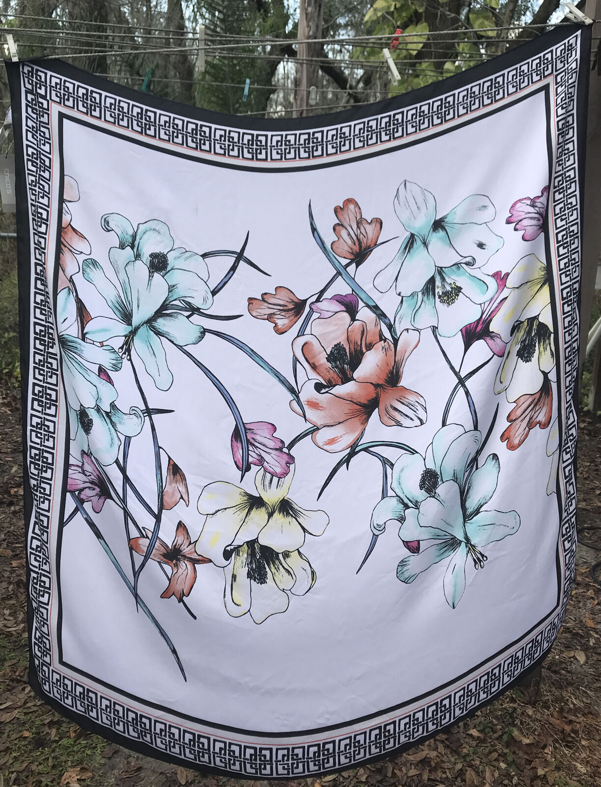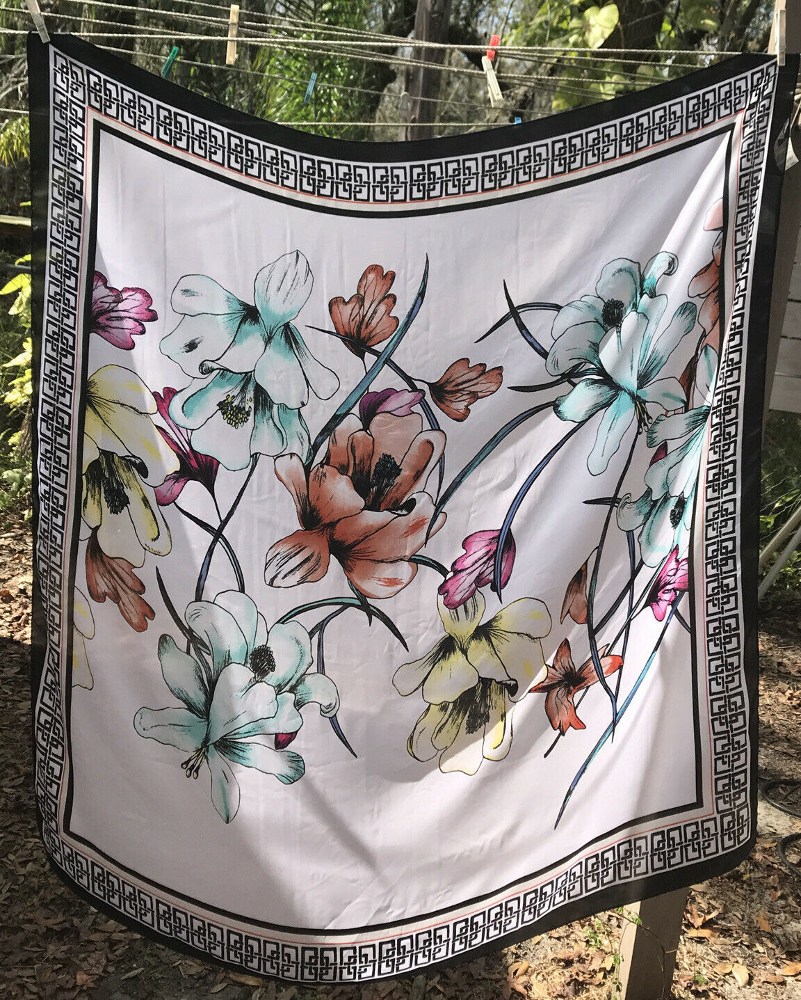 Artsy larger one size Fashion! Greek key style border surrounding center focal florals ~ measures approx. 42" square shaped. Easy care: machine wash cold water gentle cycle ~ line dry/warm iron only.