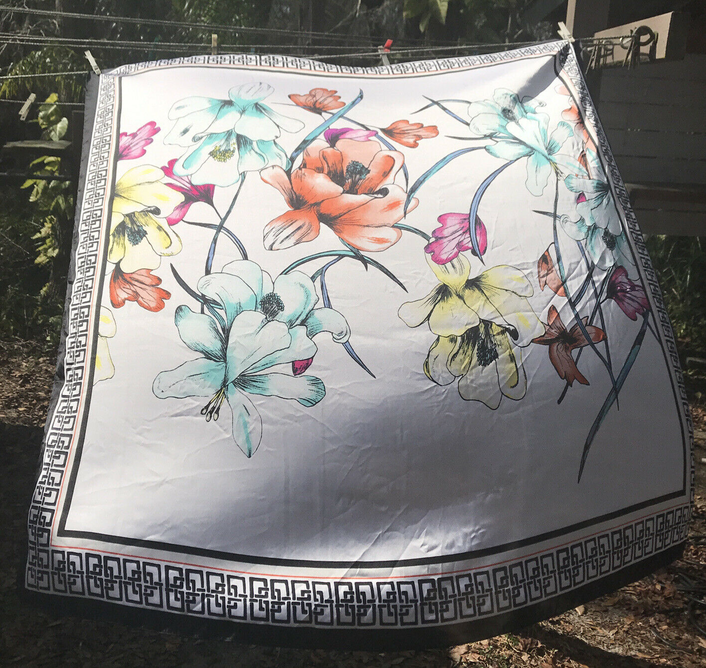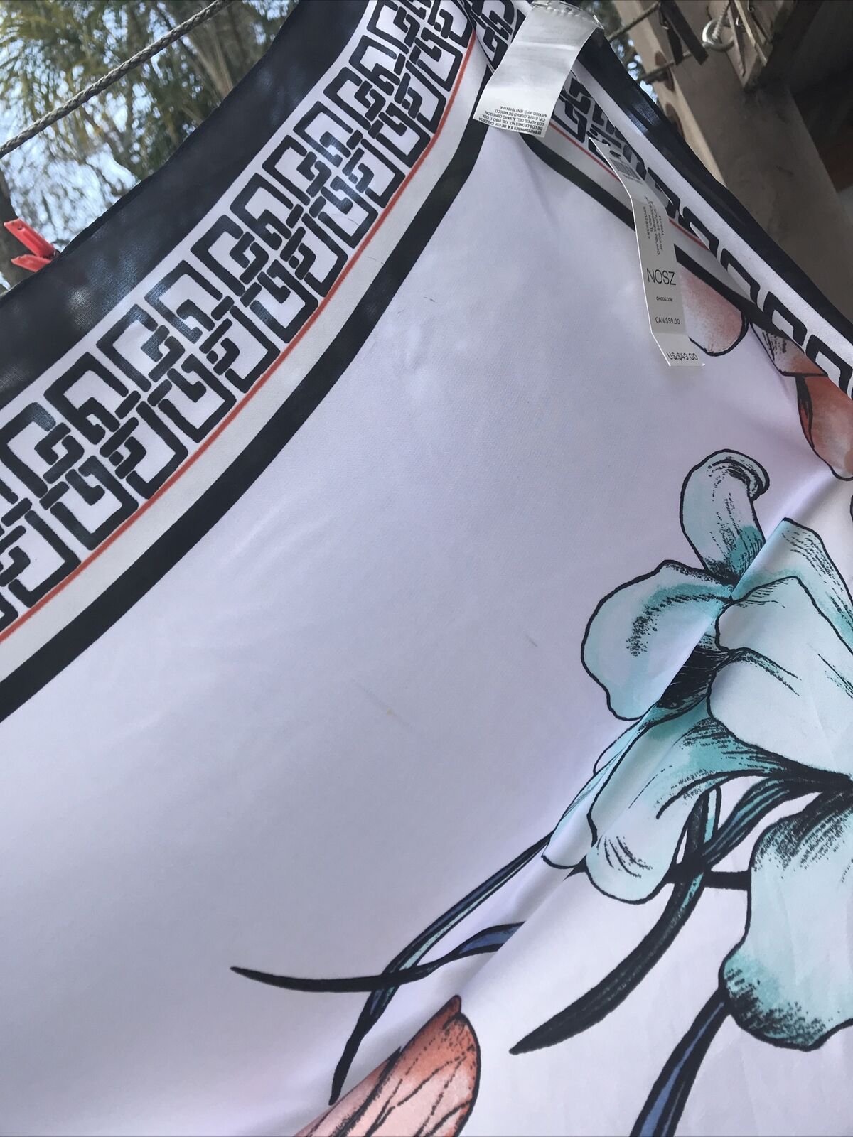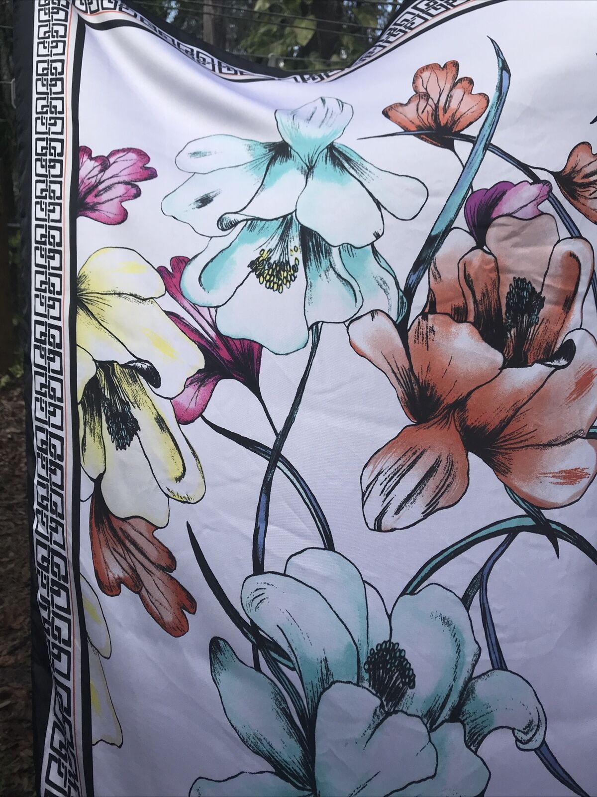 Artsy larger one size Fashion! Greek key style border surrounding center focal florals ~ measures approx. 42" square shaped. Easy care: machine wash cold water gentle cycle ~ line dry/warm iron only.