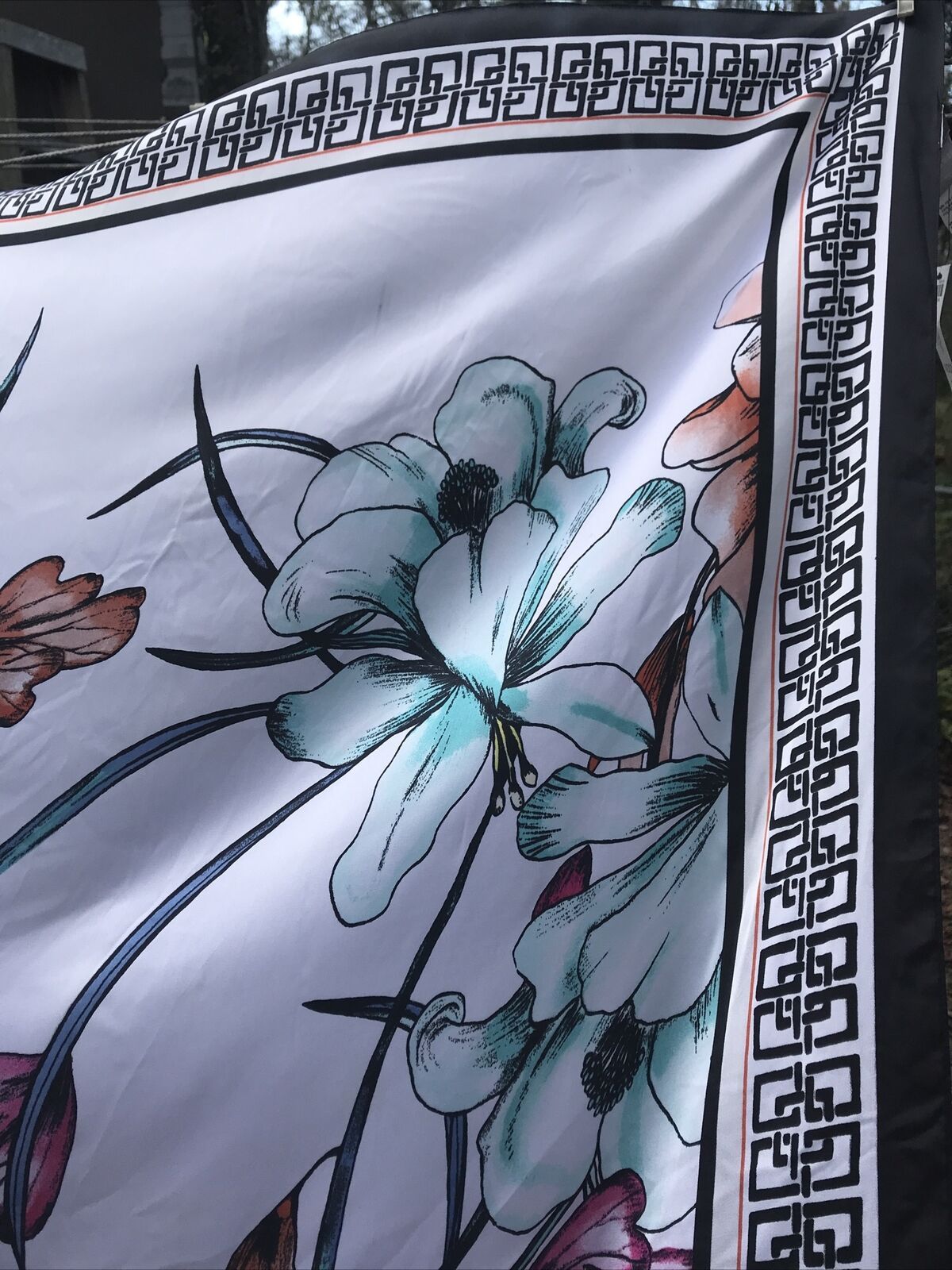 NWT Chico's Greek Key Floral Scarf 42" Sq. 100% Silky Poly as is enjoy Wear or Frame as Wall Art Decor.