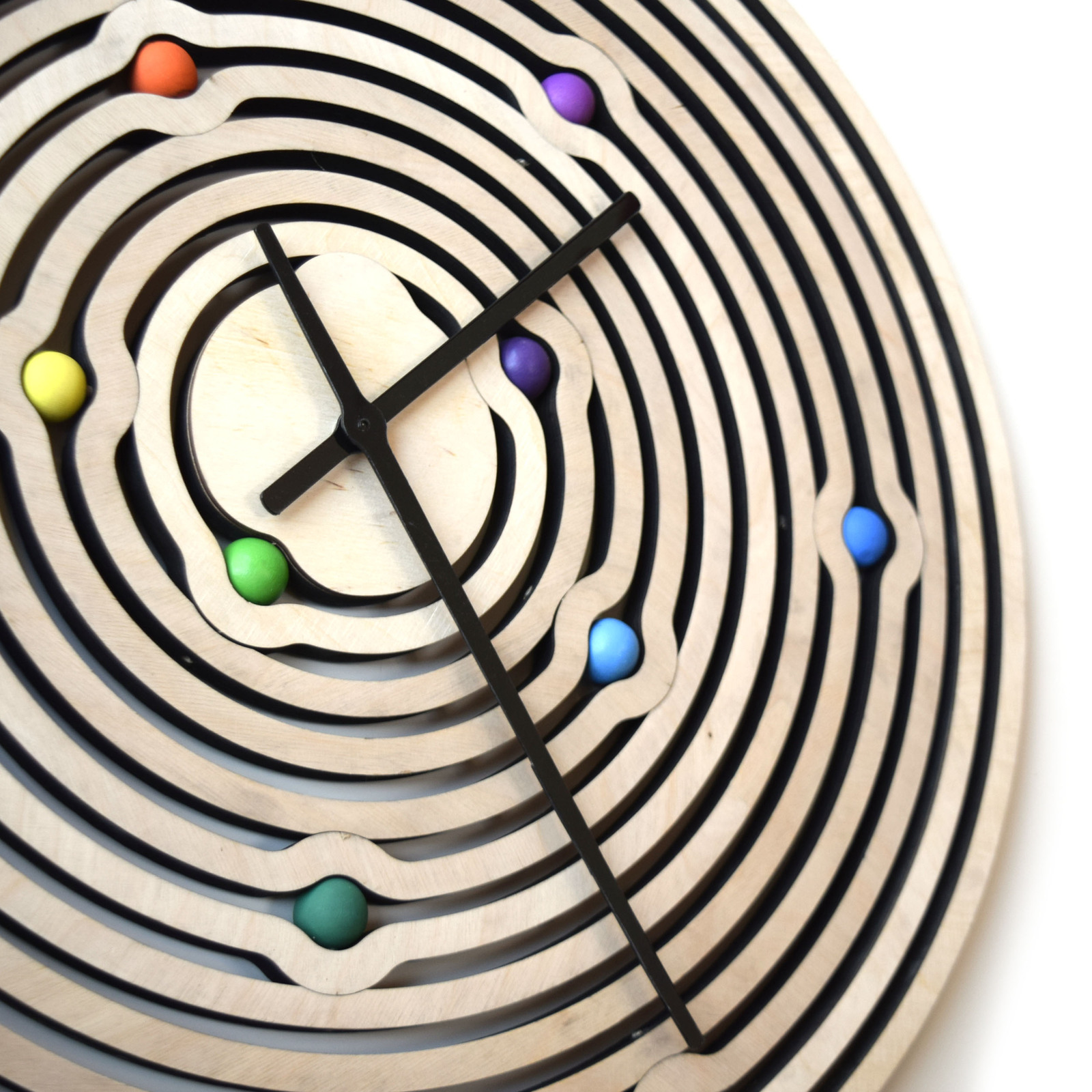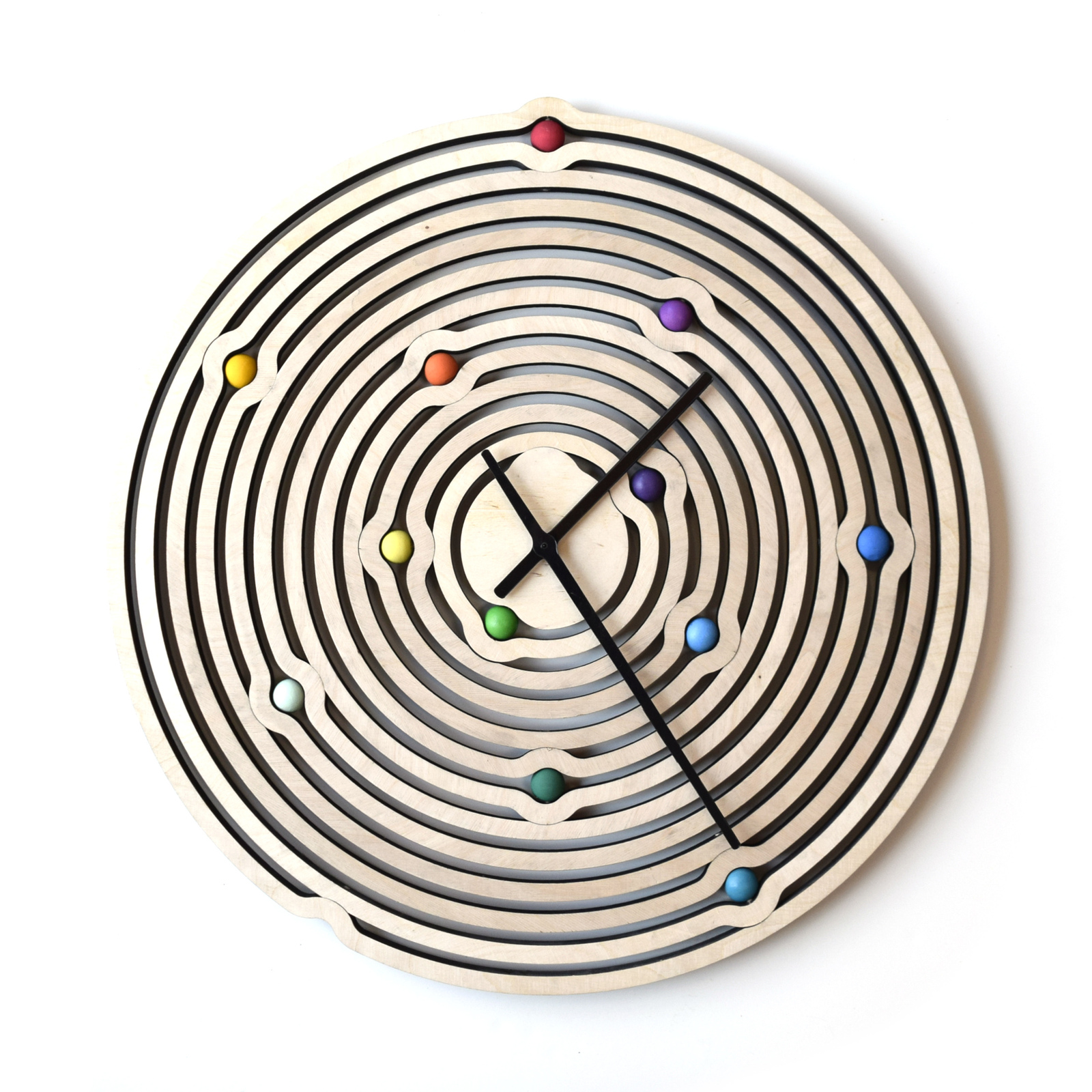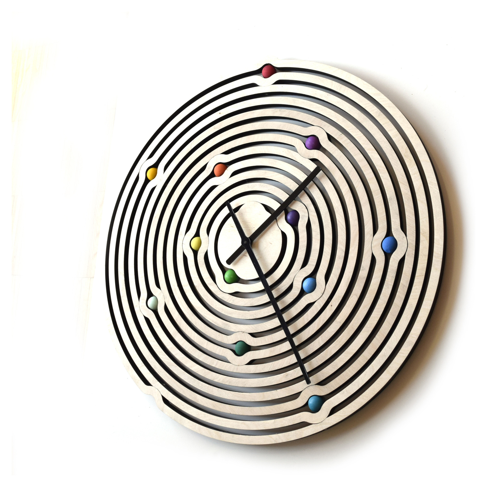 - Manufacturing process: the 13 concentric rings that compose the dial are laser cut off the 15mm plywood board. After polishing the rings are fixed together with wooden rods that also hold the colored balls. the balls are painted 12 glossy shades of the rainbow, while the rings remain natural (light brown).