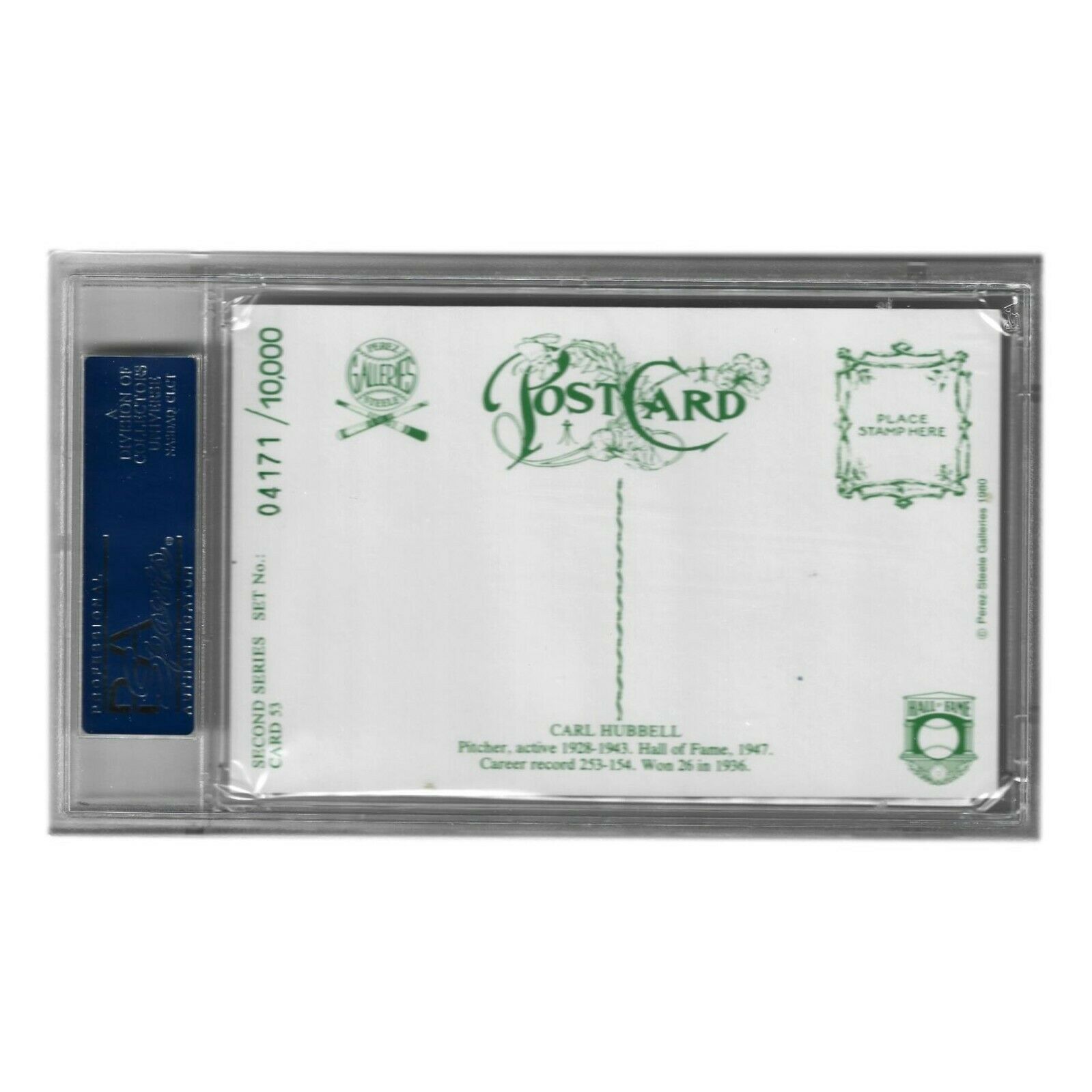 Giants fans, this item is your calling! Check out this 1980 Perez-Steele #53 Post Card Hand Signed by Carl Hubbell ! This post card is limited edition out of only 10,000 ever made, but that is for the post card itself without a signature, so really these are a lot more rare when autographed like the one here we have up for sale.This card has been encapsulated by PSA/DNA for long-term preservation of the card, as well as authenticated by them as being an authentic signature. PSA/DNA as you may already know, is one of the largest and must reputable autograph authentication companies in the industry today! This is a must-have item for your man cave, game room lady lair or office!