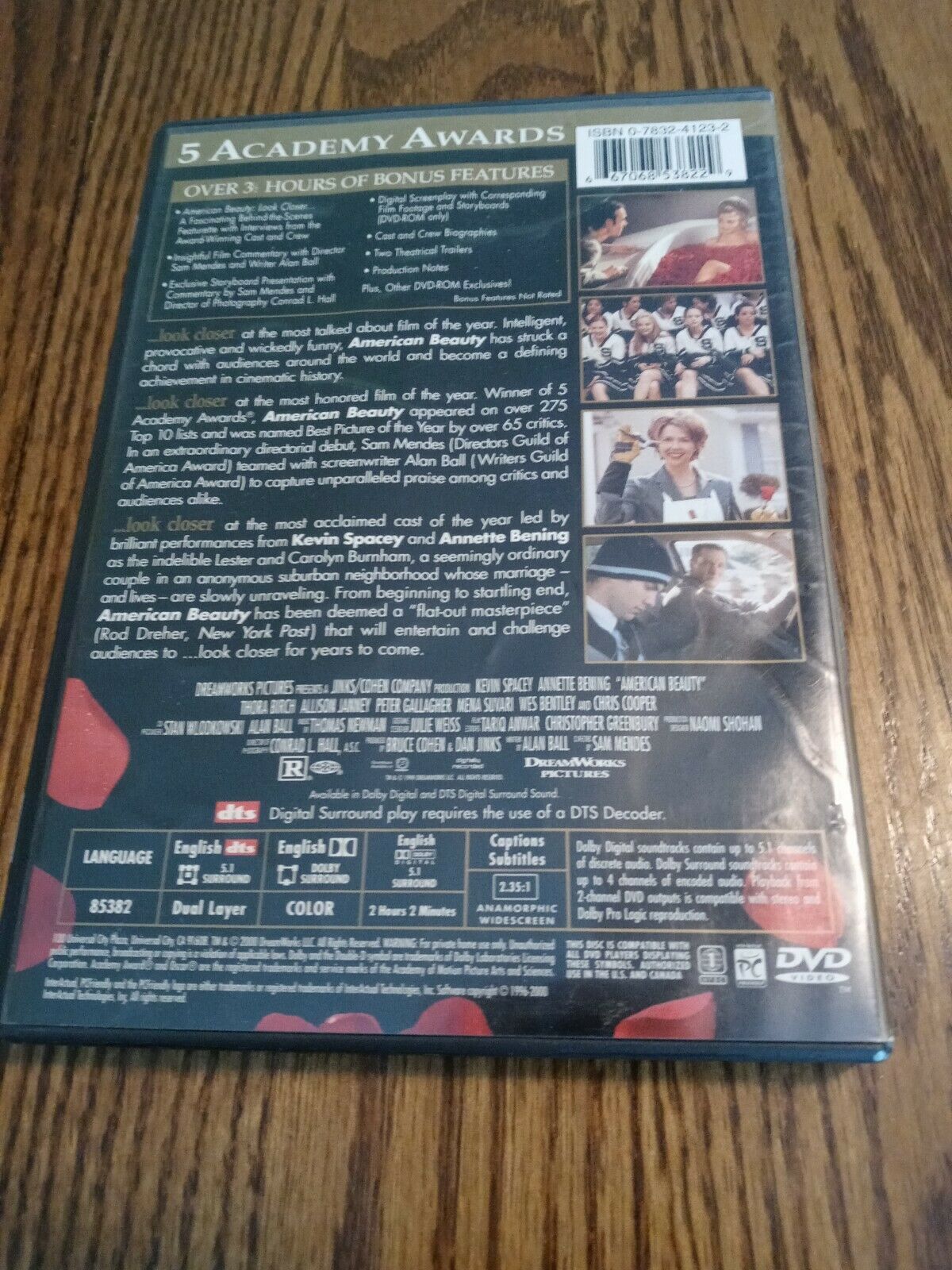American Beauty (1999) - DVD - VERY GOOD. Condition is "Very Good". Shipped with USPS First Class.Very Good Condition ; Condition is Used-See Pictures Attached For Exact Condition . Shipped with USPS First Class Mail . You Will Receive 1 ea DVD as shown in pictures attached. SHIPS N 24 HOURS Packed By Our Award Winning Packaging And Shipping Department Long Time E-commerce Seller For Over 20 Years LIMITED AVAILABILITY THANK YOU FOR SUPPORTING OUR FAMILY OWNED USA BUSINESS Collectible Very Good Condition DVD ( DVD And Case Has Wear See Pictures Attached For Exact Description) - DVD's Are Tested And Cleaned With Our Professional DVD Cleaning Equipment Before Shipped - Ships Immediately - Great Product at a Unbelievable Price - Your Chance To Own This Collectible DVD Before Its Gone. Inventory Box #6289
