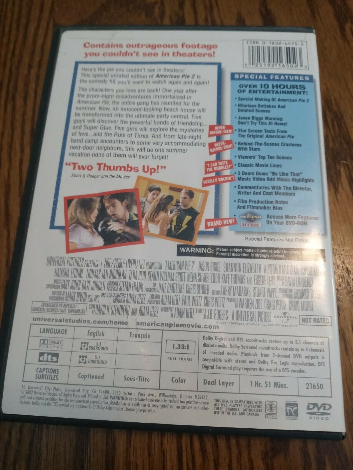 American Pie 2 (Unrated Full Screen Collector's Edition) - DVD - VERY GOOD. Condition is "Very Good". Shipped with USPS First Class.Very Good Condition ; Condition is Used-See Pictures Attached For Exact Condition . Shipped with USPS First Class Mail . You Will Receive 1 ea DVD as shown in pictures attached. SHIPS N 24 HOURS Packed By Our Award Winning Packaging And Shipping Department Long Time E-commerce Seller For Over 20 Years LIMITED AVAILABILITY THANK YOU FOR SUPPORTING OUR FAMILY OWNED USA BUSINESS Collectible Very Good Condition DVD ( DVD And Case Has Wear See Pictures Attached For Exact Description) - DVD's Are Tested And Cleaned With Our Professional DVD Cleaning Equipment Before Shipped - Ships Immediately - Great Product at a Unbelievable Price - Your Chance To Own This Collectible DVD Before Its Gone. Inventory Box #6280