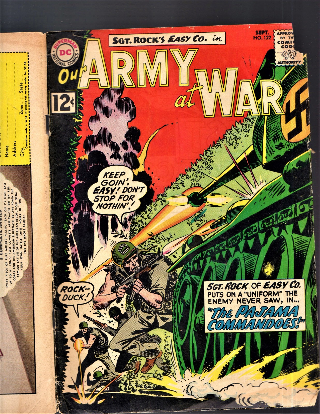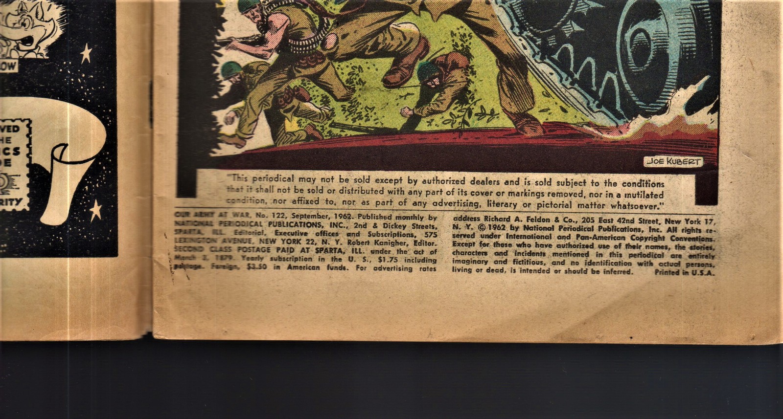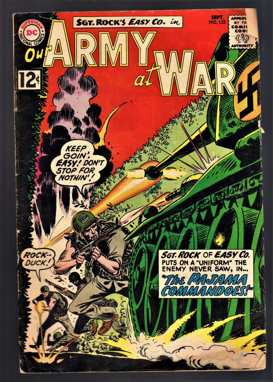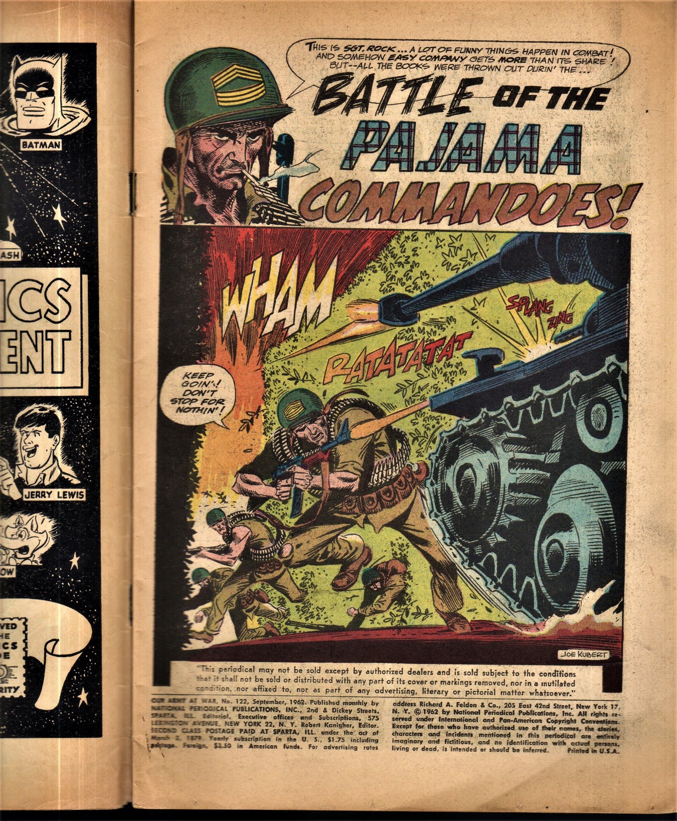 Cover art by Joe Kubert. Battle of the Pajama Commandos starring Sgt. Rock, script by Bob Kanigher, art by Joe Kubert. Battle of the Bucket Ship, script by Bob Haney, art by Irv Novick. 36 Pages, Full Color. Cover price $0.12.