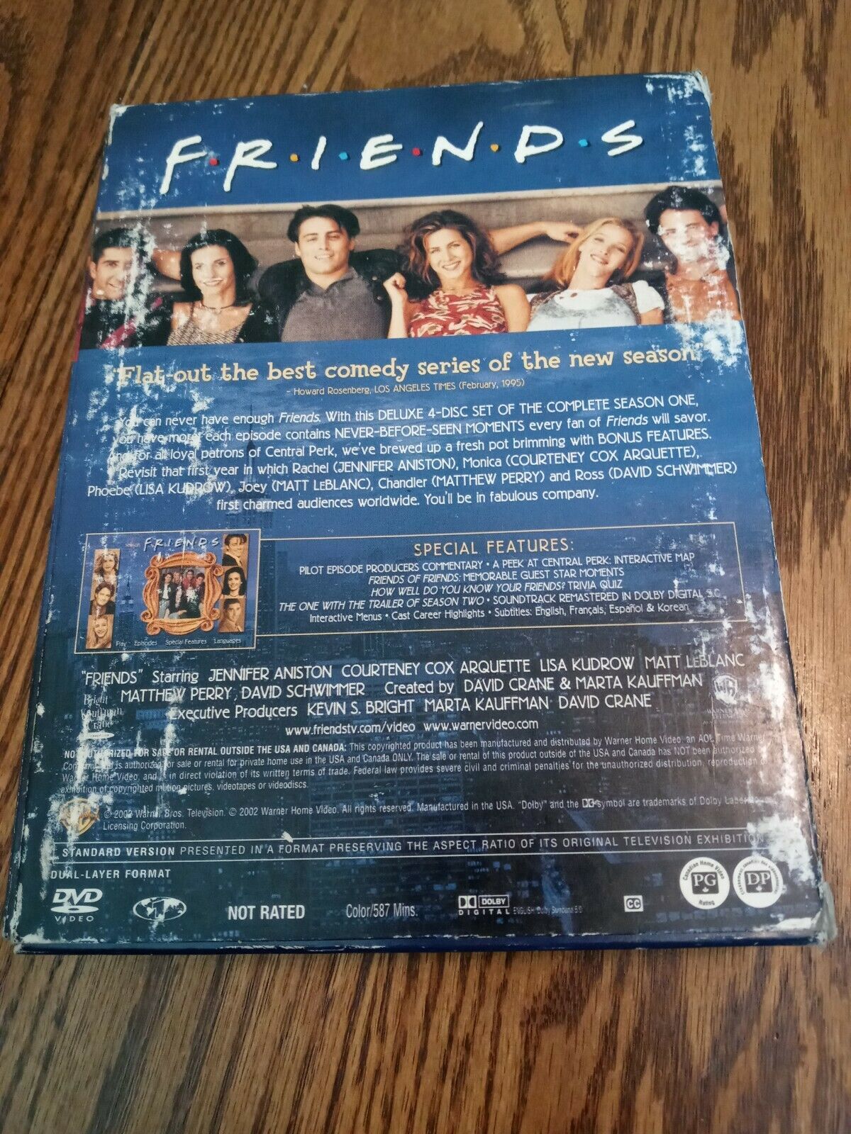 Friends: Season 1 (DVD, 2003).Very Good Condition ; Condition is Used-See Pictures Attached For Exact Condition . Shipped with USPS First Class Mail . You Will Receive 1 ea DVD as shown in pictures attached. SHIPS N 24 HOURS Packed By Our Award Winning Packaging And Shipping Department Long Time E-commerce Seller For Over 20 Years LIMITED AVAILABILITY THANK YOU FOR SUPPORTING OUR FAMILY OWNED USA BUSINESS Collectible Very Good Condition DVD ( DVD And Case Has Wear See Pictures Attached For Exact Description) - DVD's Are Tested And Cleaned With Our Professional DVD Cleaning Equipment Before Shipped - Ships Immediately - Great Product at a Unbelievable Price - Your Chance To Own This Collectible DVD Before Its Gone. Inventory Box #6284