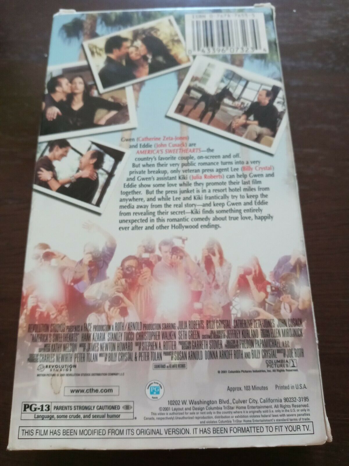 America's Sweethearts VHS VCR Video Tape Movie Julia Roberts, John Cusack Used.Very Good Condition; Condition is Used-See Pictures Attached For Exact Condition . Shipped with USPS First Class Mail . You Will Receive 1 ea VHS as shown in pictures attached. SHIPS N 24 HOURS Packed By Our Award Winning Packaging And Shipping Department Long Time E-commerce Seller For Over 20 Years LIMITED AVAILABILITY THANK YOU FOR SUPPORTING OUR FAMILY OWNED USA BUSINESS Collectible Very Good Condition VHS (VHS And Case Has Wear See Pictures Attached For Exact Description) - Ships Immediately - Great Product at a Unbelievable Price - Your Chance To Own This Collectible VHS Before Its Gone. Inventory Box #6275
