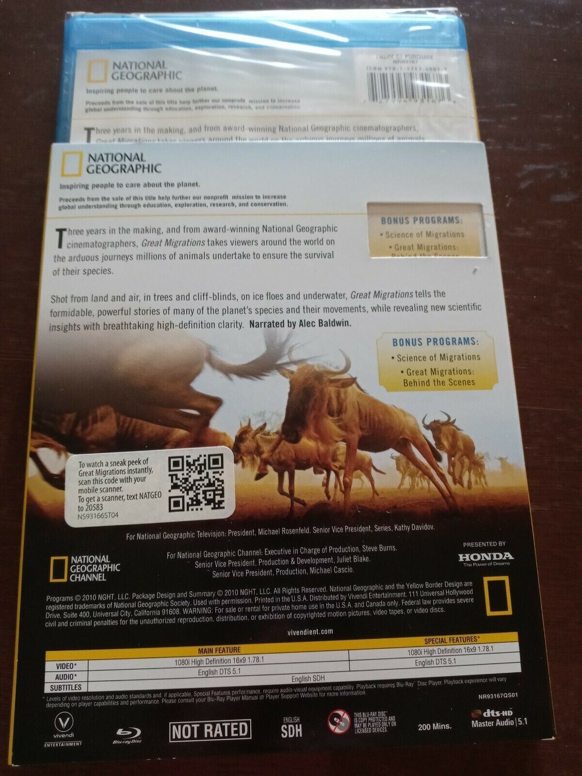 National Geographic: Great Migrations (Blu-ray Disc, 2010, 2-Disc Set) Brand New. Condition is "Brand New". Shipped with USPS Media Mail.New Condition ;