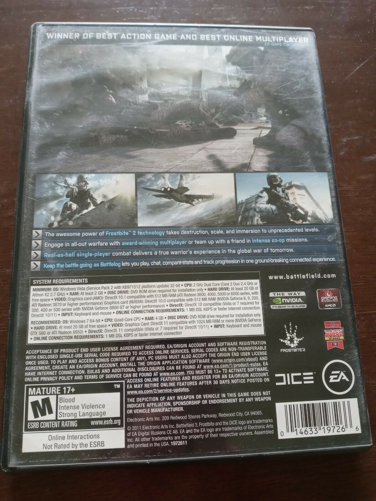 Battlefield 3 (PC, 2011). Condition is "Very Good". Shipped with USPS Media Mail.Very Good Condition ; Condition is Used-See Pictures Attached For Exact Condition . Shipped with USPS First Class Mail . You Will Receive 1 ea PC CD ROM as shown in pictures attached. SHIPS N 24 HOURS Packed By Our Award Winning Packaging And Shipping Department Long Time E-commerce Seller For Over 20 Years LIMITED AVAILABILITY THANK YOU FOR SUPPORTING OUR FAMILY OWNED USA BUSINESS Collectible Very Good Condition PC CD ROM (Has Wear See Pictures Attached For Exact Description) - CD's Are Tested And Cleaned With Our Professional CD Cleaning Equipment Before Shipped - Ships Immediately - Great Product at a Unbelievable Price - Your Chance To Own This Collectible PC CD ROM Before Its Gone. Inventory Box #6215