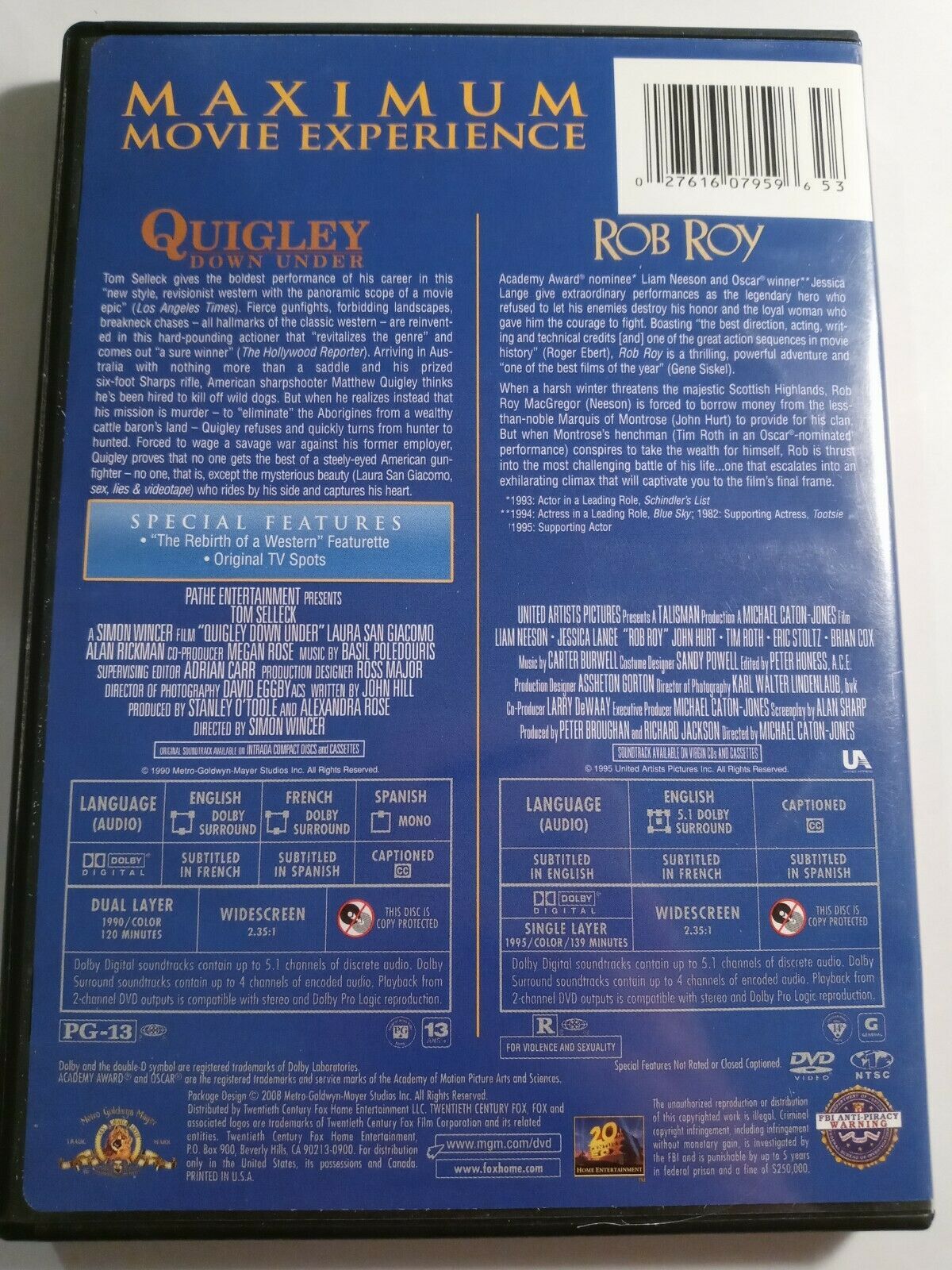 Quigley Down Under/Rob Roy (2 DVD Set, 2008) Liam Neeson Tom Selleck VERY GOOD
