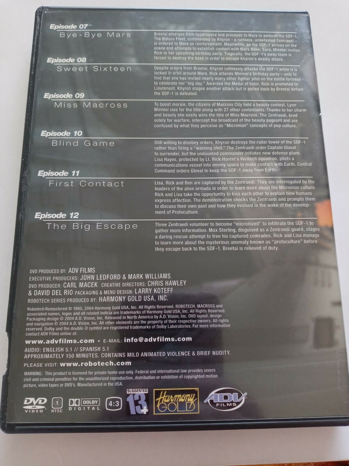 Robotech Remastered: The Extended Edition - Macross Saga Disc 2 DVD. Condition is "Very Good". Shipped with USPS First Class.Very Good Condition ; Condition is Used-See Pictures Attached For Exact Condition . Shipped with USPS First Class Mail . You Will Receive 1 ea DVD as shown in pictures attached. RARE VINTAGE COLLECTIBLE SHIPS N 24 HOURS Packed By Our Award Winning Packaging And Shipping Department Long Time E-commerce Seller For Over 20 Years LIMITED AVAILABILITY THANK YOU FOR SUPPORTING OUR FAMILY OWNED USA BUSINESS Collectible Very Good Condition DVD ( DVD And Case Has Wear See Pictures Attached For Exact Description) - DVD's Are Tested And Cleaned With Our Professional DVD Cleaning Equipment Before Shipped - Ships Immediately - Great Product at a Unbelievable Price - Your Chance To Own This Collectible DVD Before Its Gone. Inventory Box #6201