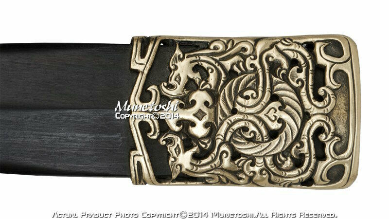Scabbard: The scabbard is masterfully made with exotic dark wood, with the wood contouring to the shape of the sword. The pommel of the scabbard is handcrafted brass with a dragon design cutout. A black silk cord is tied around the upper half of the scabbard with a handcrafted brass carrying clip with a dragon motif. The scabbard throat has been seamlessly fitted to the guard.