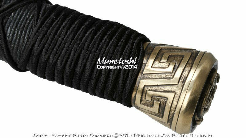 Handle: The handle core is made of wood, with black silk cord tightly wrapped around the handle in the traditional "X" pattern. The guard is also handcrafted brass, and displays intricately detailed dragons. The pommel has a dragon motif, also of handcrafted brass.