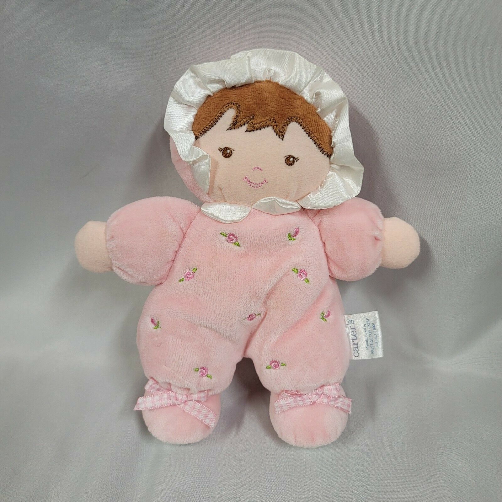 Carters Prestige Doll Brown Hair First Baby Doll Pink Roses Bonnet Flower Rattle