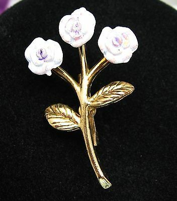 In a goldtone metal, this vintage pin has THREE rose blooms! Painted in enamel, they have a white base with subtle touches of pink and purple and maybe a tinge of yellow!