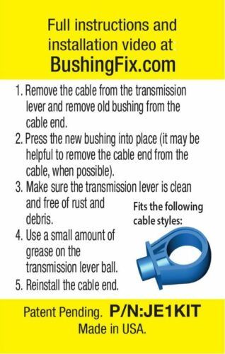 Pontiac Formula kit (US patent #10,619,723 and #10,215,273) allows you to quickly and easily repair your shift cable by replacing the bushing. The patented custom molded replacement bushing ensures a quality repair with ease. A professional can perform this repair in under 5 minutes, average time for a non-professional is less than 10 minutes. This bushing is made from a material that was designed to outlast the factory bushing and includes everything needed to install. Bushing Fix JE1KIT- Transmission Shift Cable Bushing Repair Kit ; (US Patent # 10,215,273 and US Patent # 10,619,723).