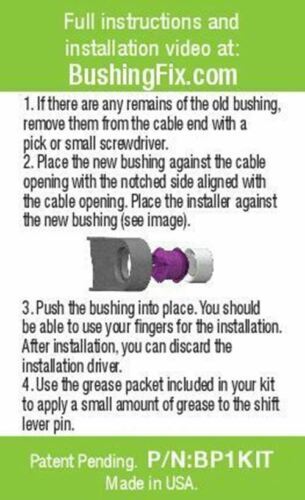 The patented (US patent #10,619,723 and #10,215,273) custom molded replacement bushing ensures a quality repair with ease. A professional can perform this repair in under 5 minutes, average time for a non-professional is less than 10 minutes. This bushing is made from a material that was designed to outlast the factory bushing and includes everything needed to install. Bushing Fix BP1KIT- Transmission Shift Cable Bushing Repair Kit ; (US Patent # 10,215,273 and US Patent # 10,619,723).