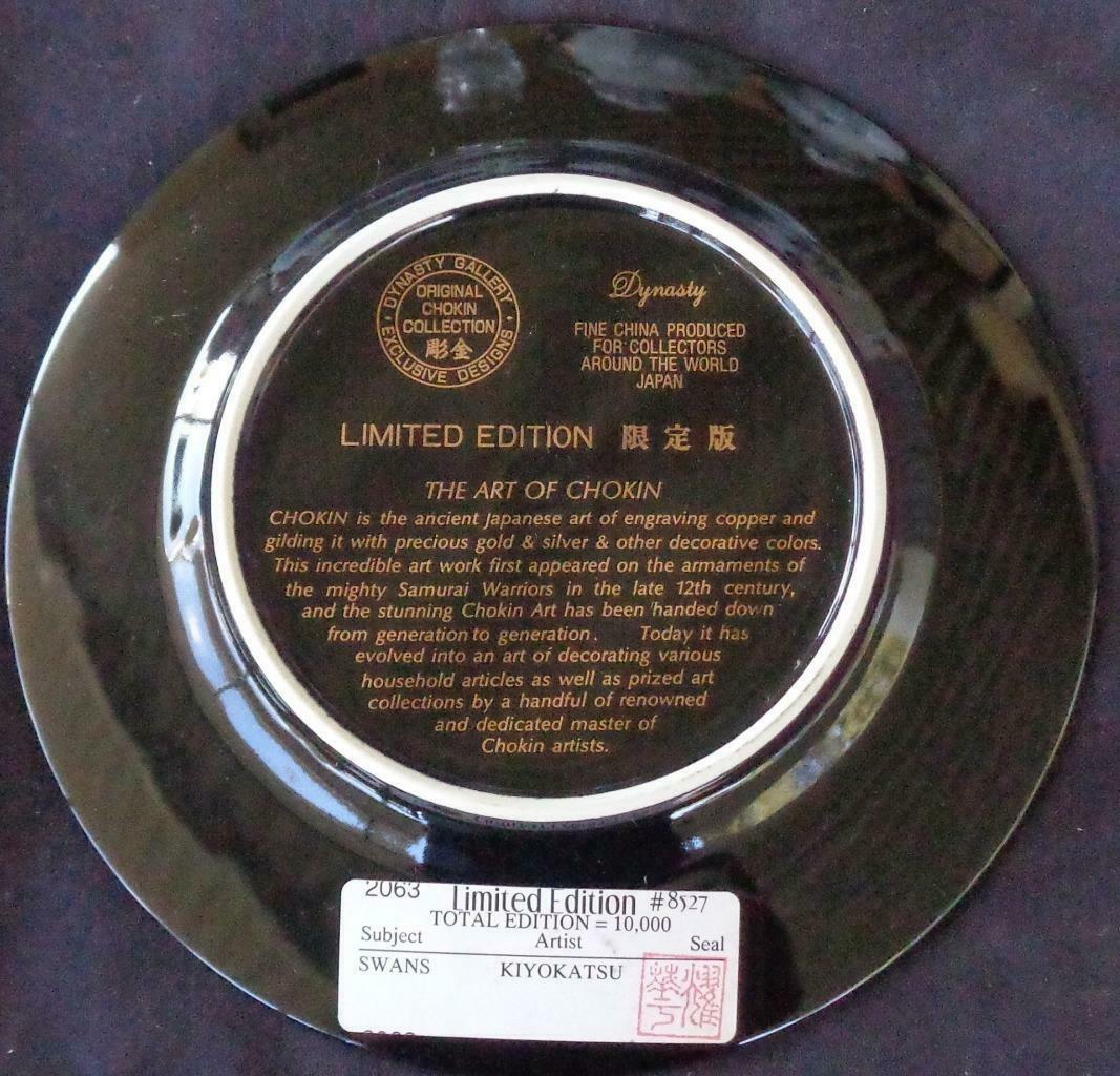 Offered here is this Gorgeous Limited Edition Chokin Art Collection Plate. It is in very good condition with little sign of wear at all, although I am unsure of the actual age of the plate. The plate has a 24k gold rim, and is a limited edition original, #8527 out of 10,000. It was offered by the Dynasty Gallery and is titled Swans. It is 7.75” in diameter. It is a gorgeous collectible Chokin Art Original Collectible plate.