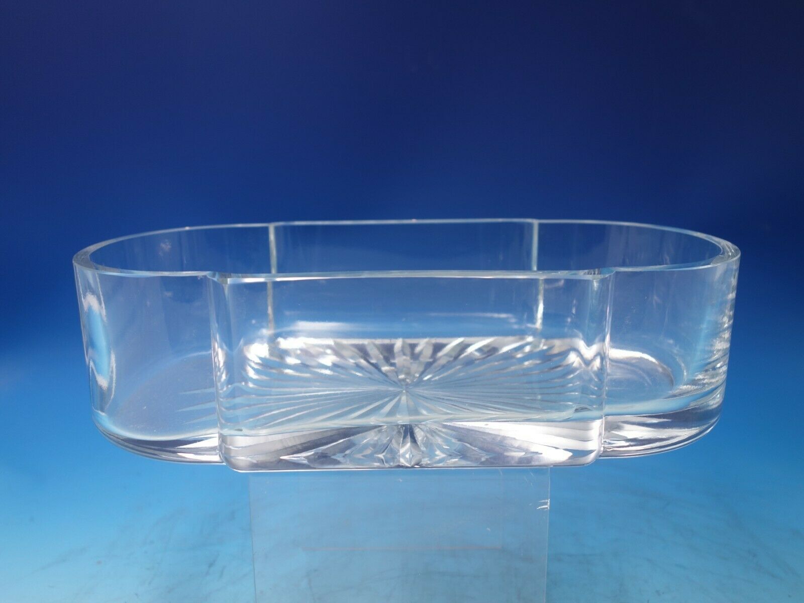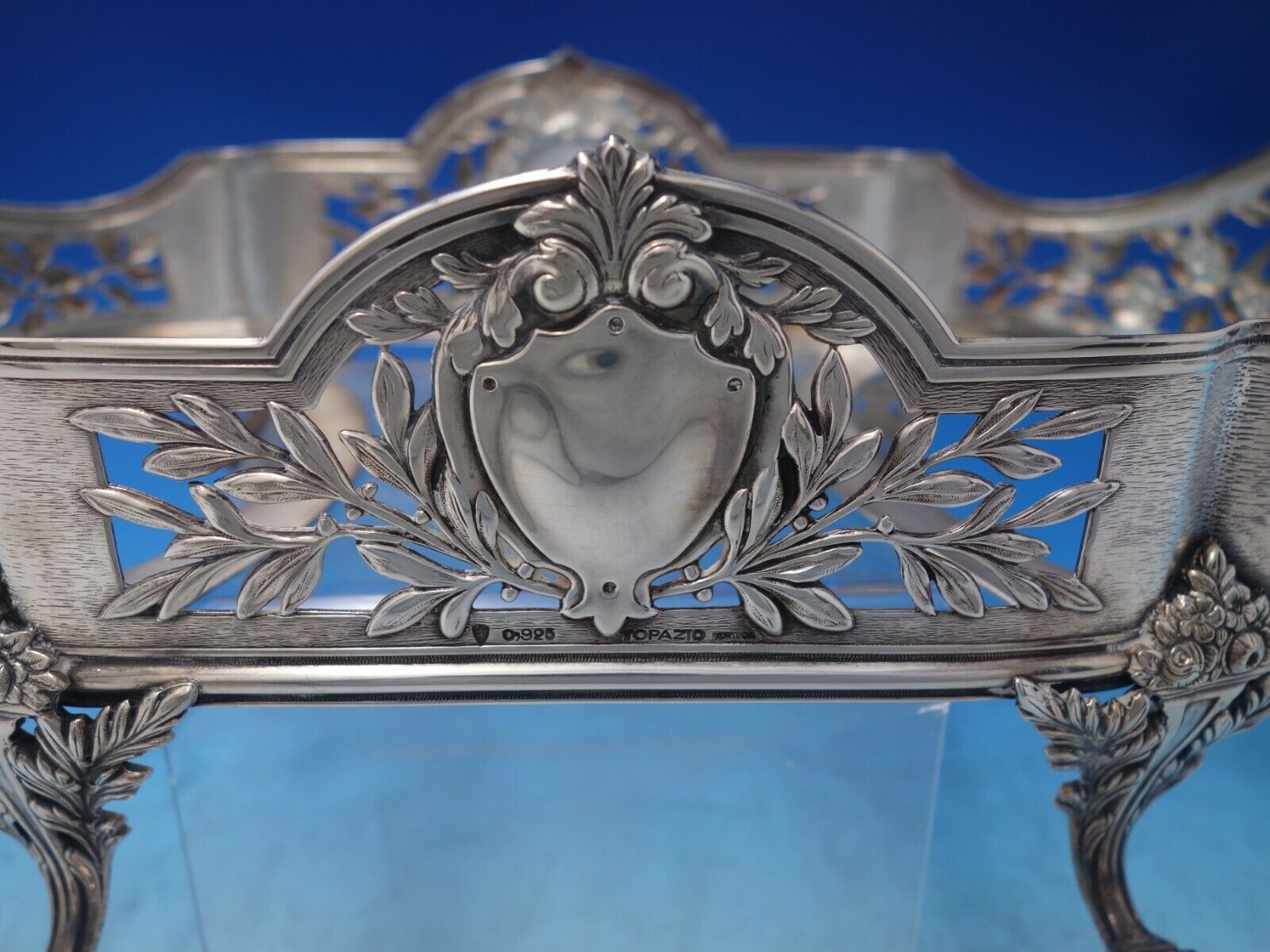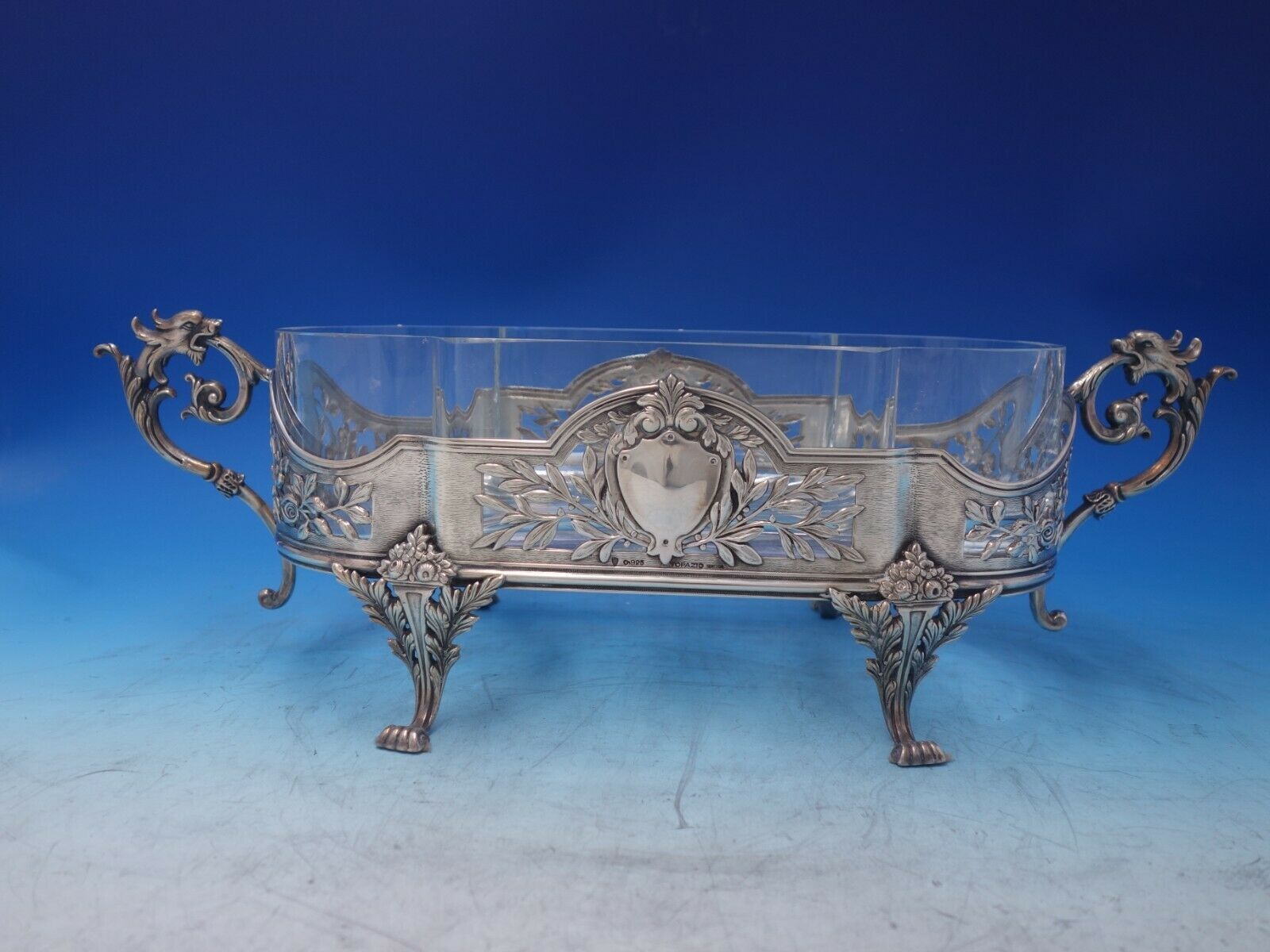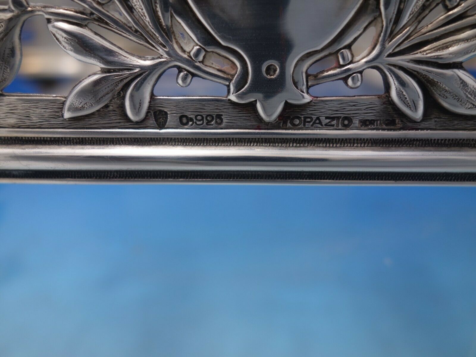 Lovely Portuguese sterling silver three piece centerpiece bowl on plateau by Topazio. This piece has a large bowl featuring dragon handles and glass insert. The bowl measures 12" x 6" and the holder measures 17 1/2" x 5 1/2" and weighs 23.49 troy ounces (without glass insert). The bowl rests beautifully on the the mirrored plateau which measures 18 1/2" x 11 3/4" x 2". Excellent detailing! It is not monogrammed and is in good vintage condition as seen in photos. Captivating piece!