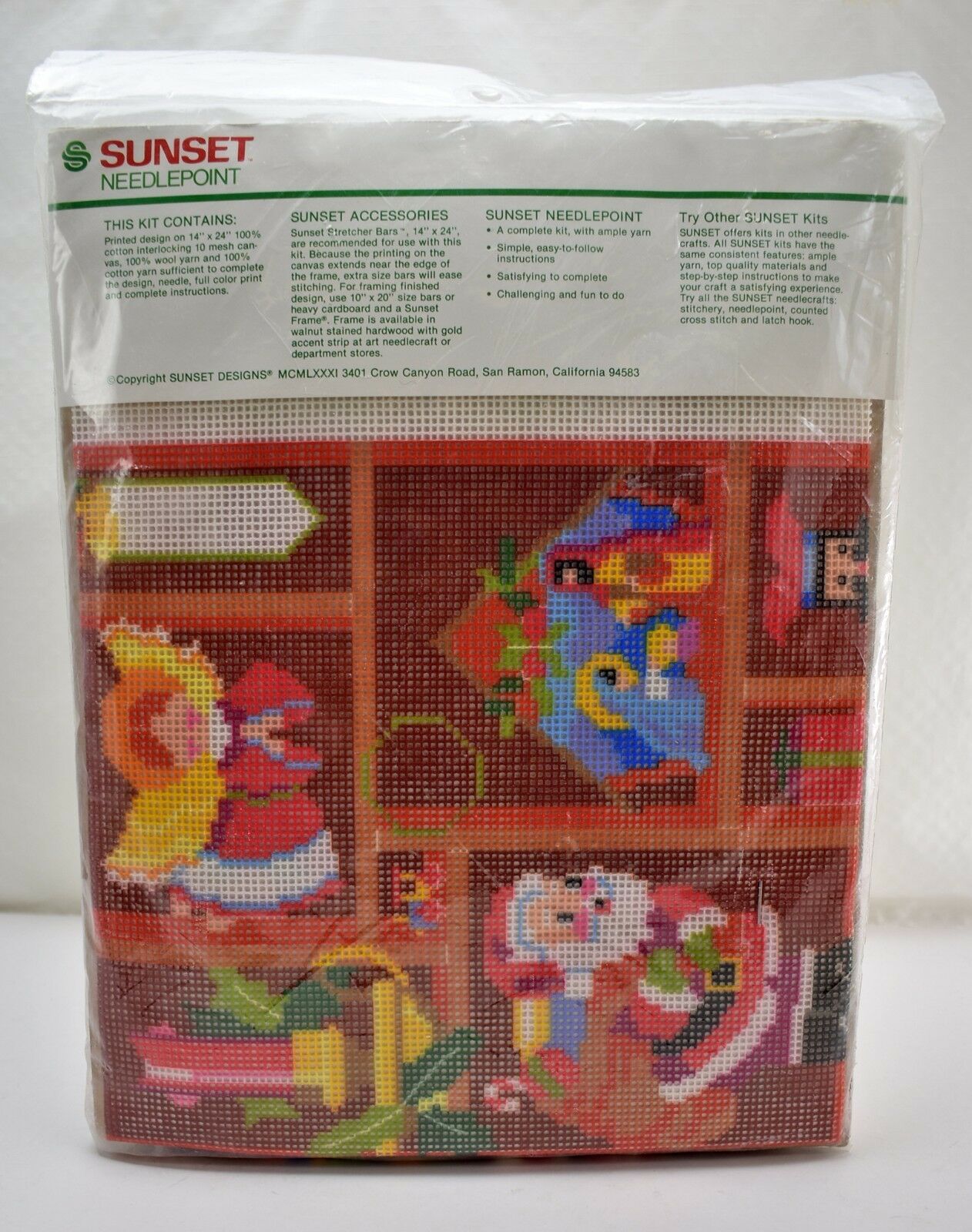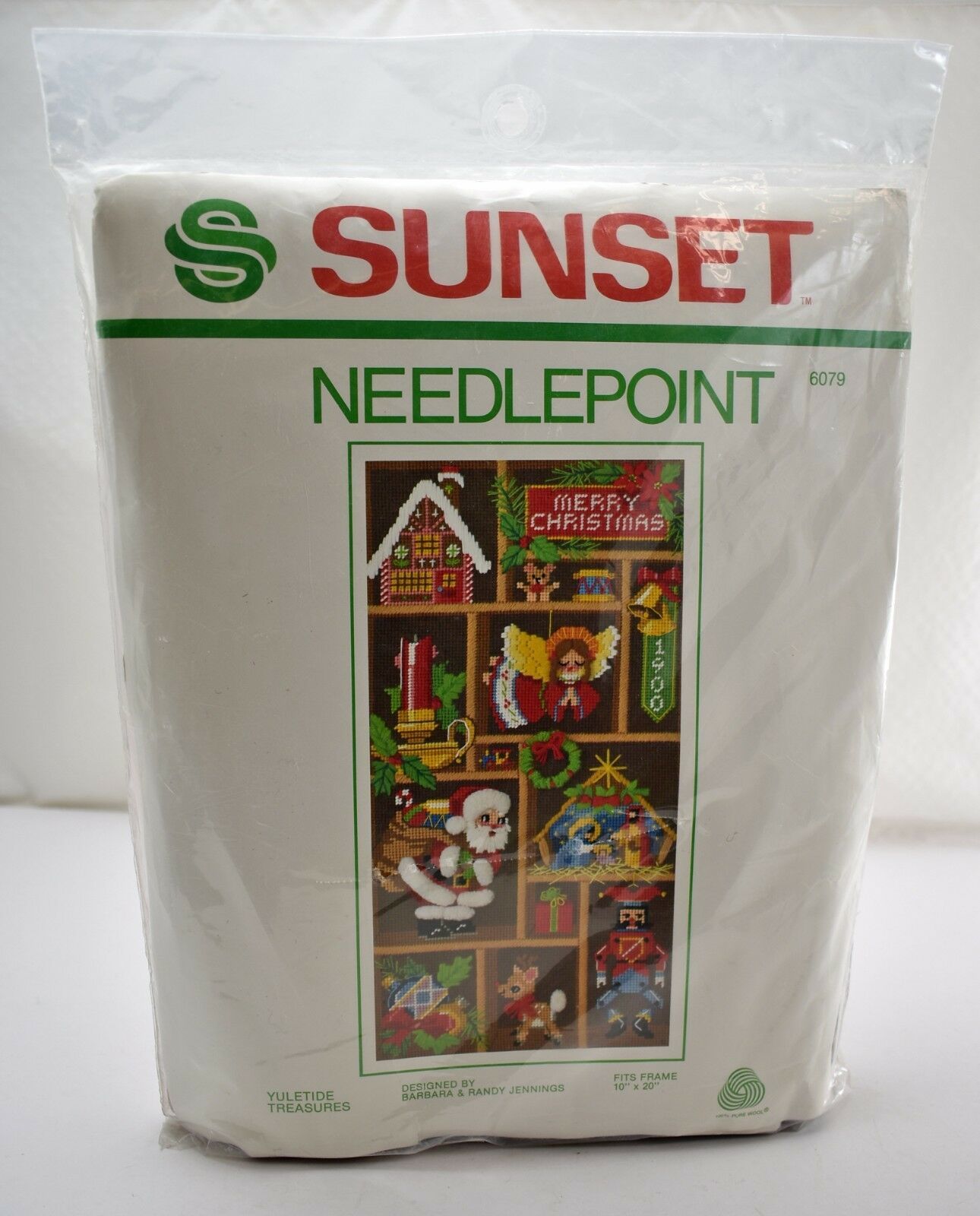 Vintage needlepoint kit Yuletide Treasures by Sunset Designs. Designed by Barbara Randy Jennings, 1981. The kit includes printed design on 14" x 24" 100% cotton interlocking 10 mesh canvas, 100% wool yarn, 100% cotton yarn, needle, full color print and complete instructions. Fits 10" x 20" frame. Please see the pictures for all the details.