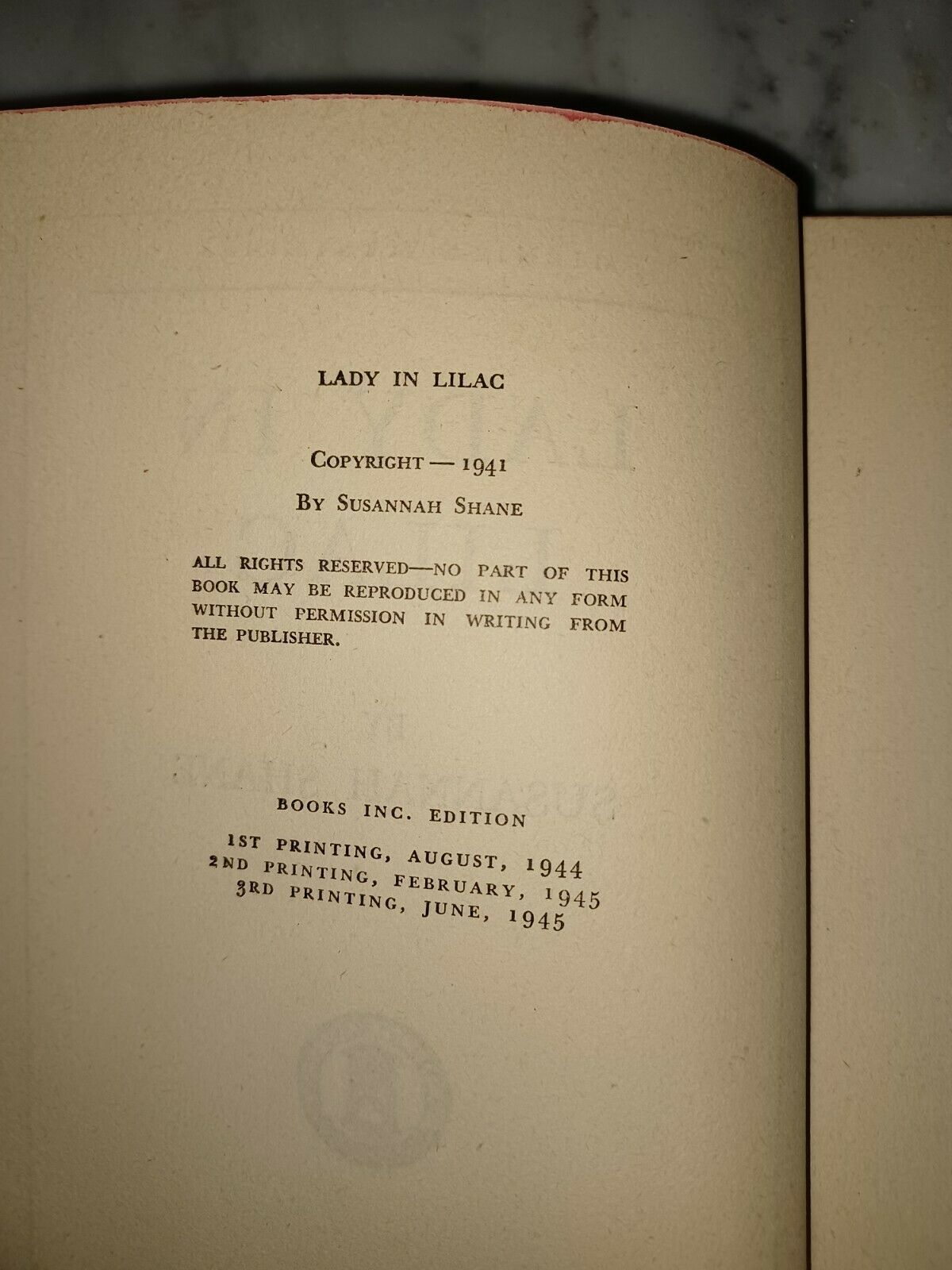 Lady in Lilac Susannah Shane Vintage Hardcover Mystery Books Inc. 1945