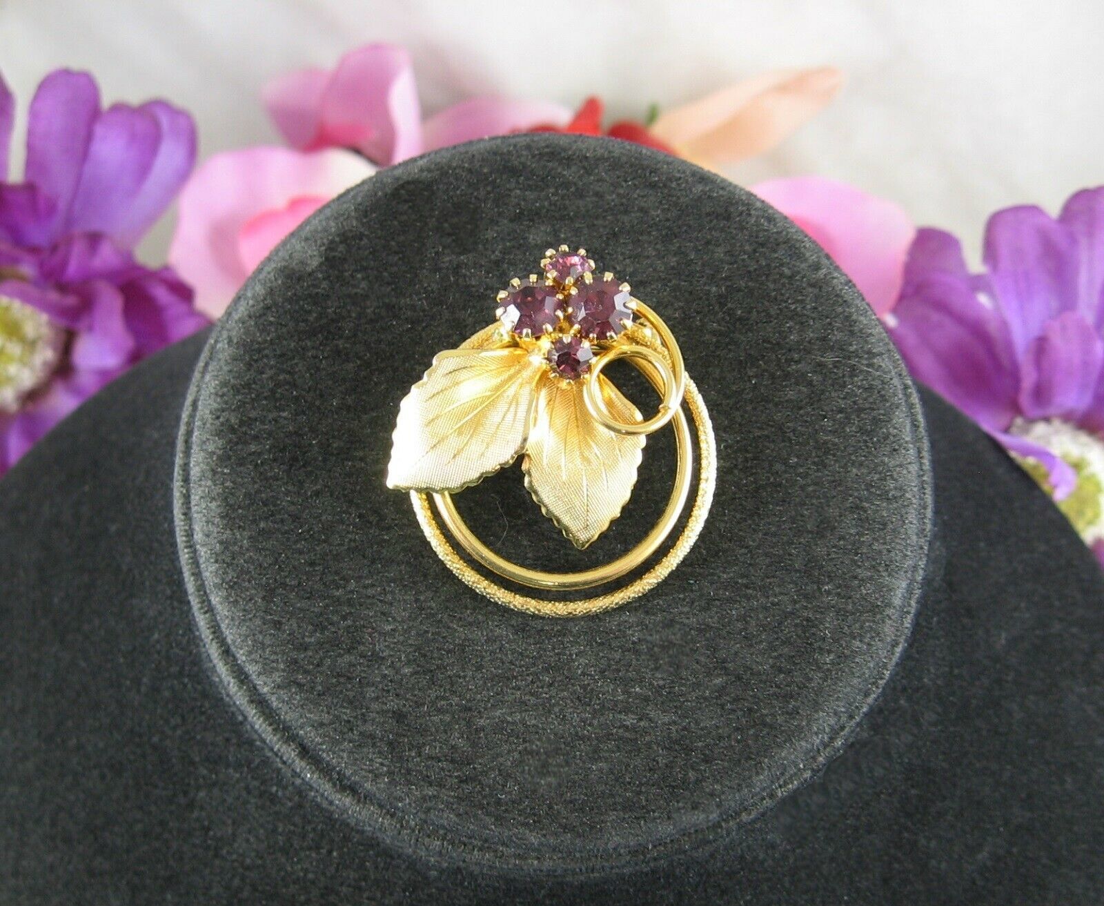 Vintage Flower PIN Dark Purple RHINESTONE CLUSTER Leaves Rings Goldtone Brooch