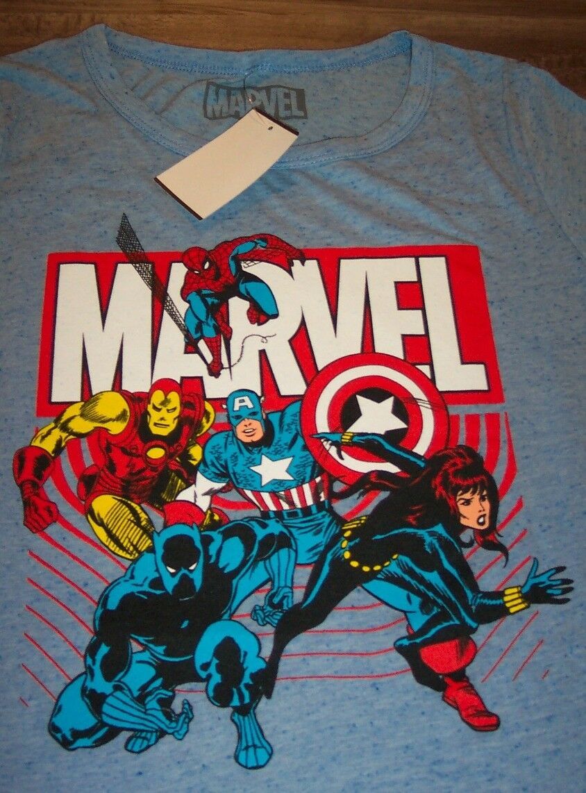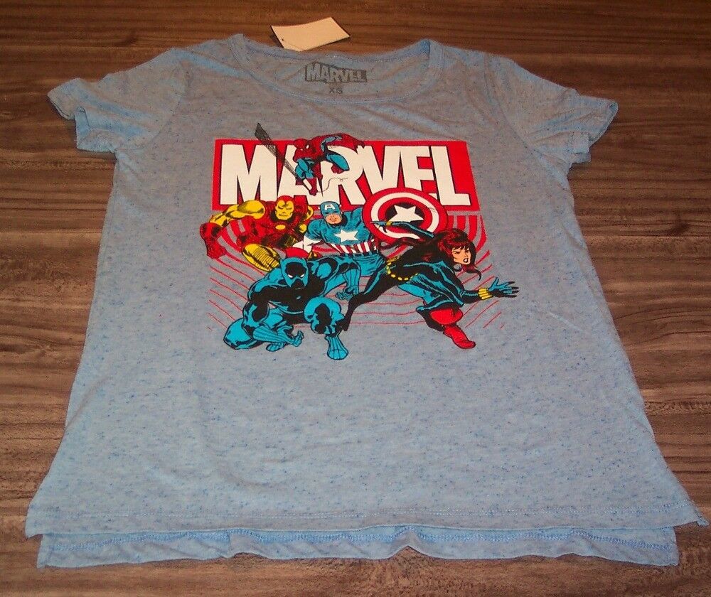 This is a VINTAGE STYLE WOMEN'S TEEN Marvel Comics THE AVENGERS CAPTAIN AMERICA, BLACK WIDOW, THE MIGHTY THOR, THE BLACK PANTHER, THE AMAZING SPIDER-MAN, T-shirt. It is a Size XS and is NEW with the tag. It is 16 1/2 inches from armpit to armpit and 23 inches in length. Combine auctions to save on shipping. AG