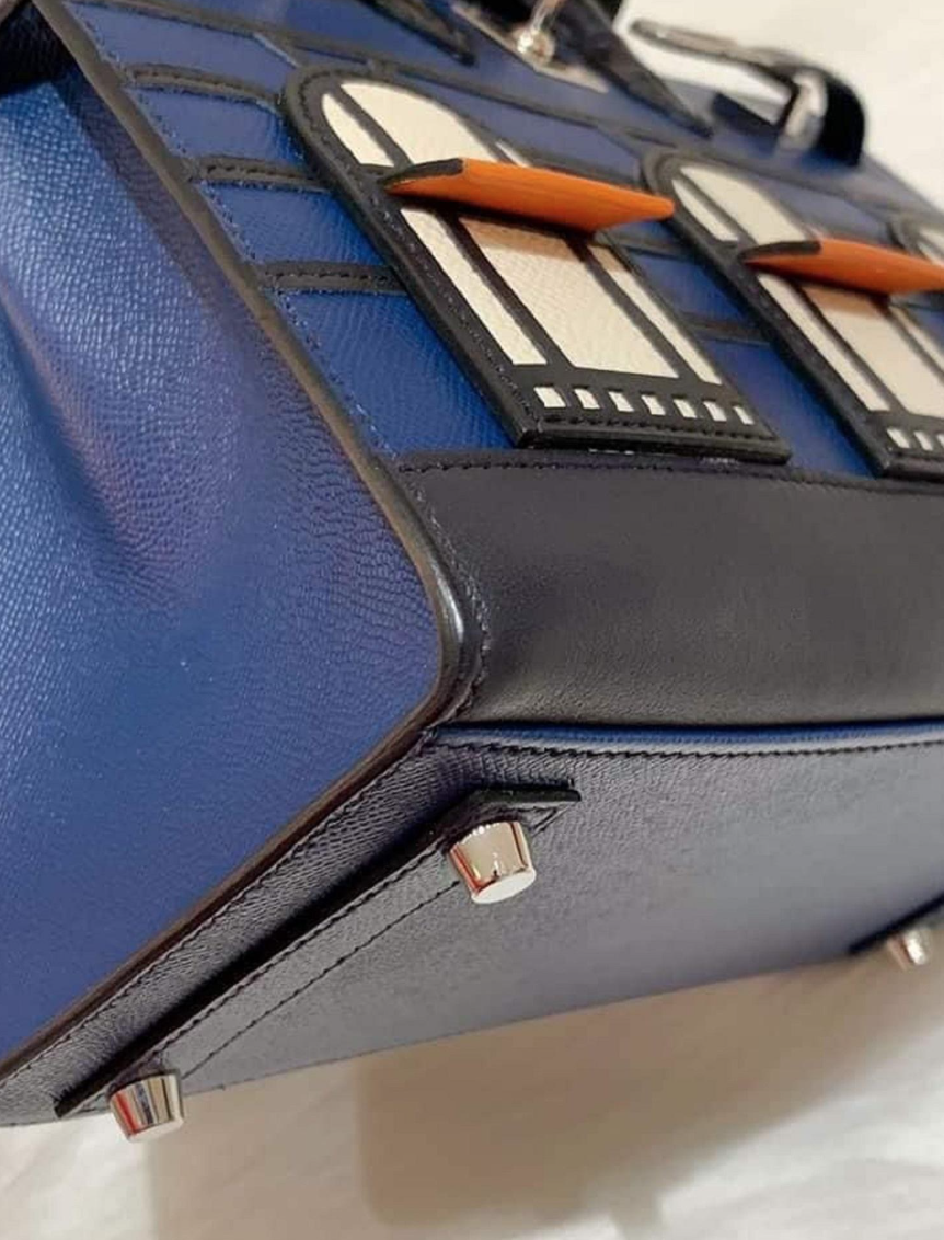 This collector's piece is crafted in matte Bleu Marine alligator, accented with palladium hardware. The structured Sellier silhouette is achieved using a meticulous blend of Madame, Epsom, Swift, and Sombrero leathers, representing the building’s facade, complete with signature orange awnings and delicate window detailing.