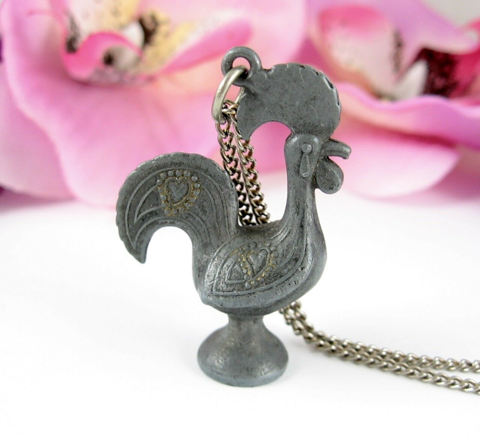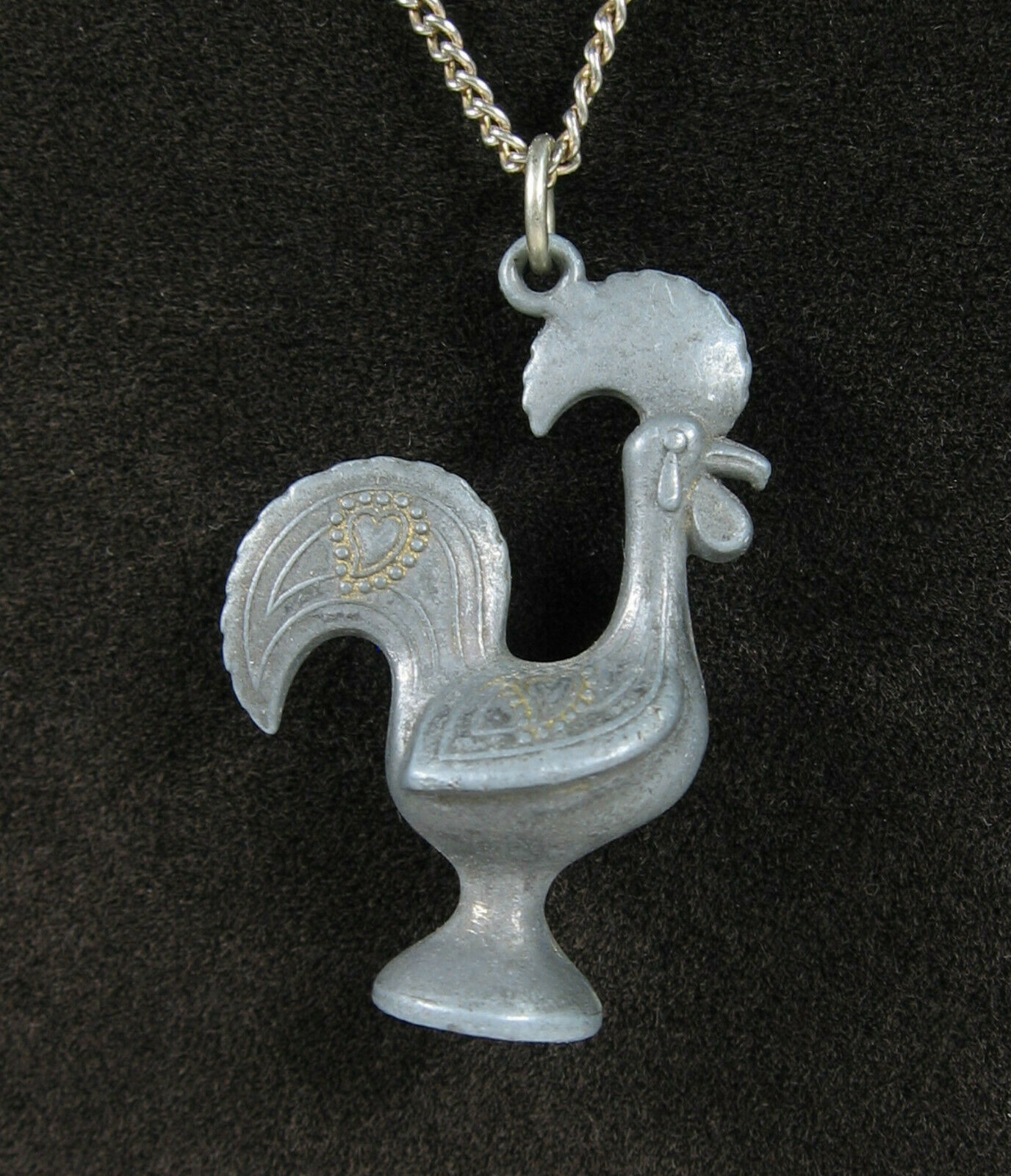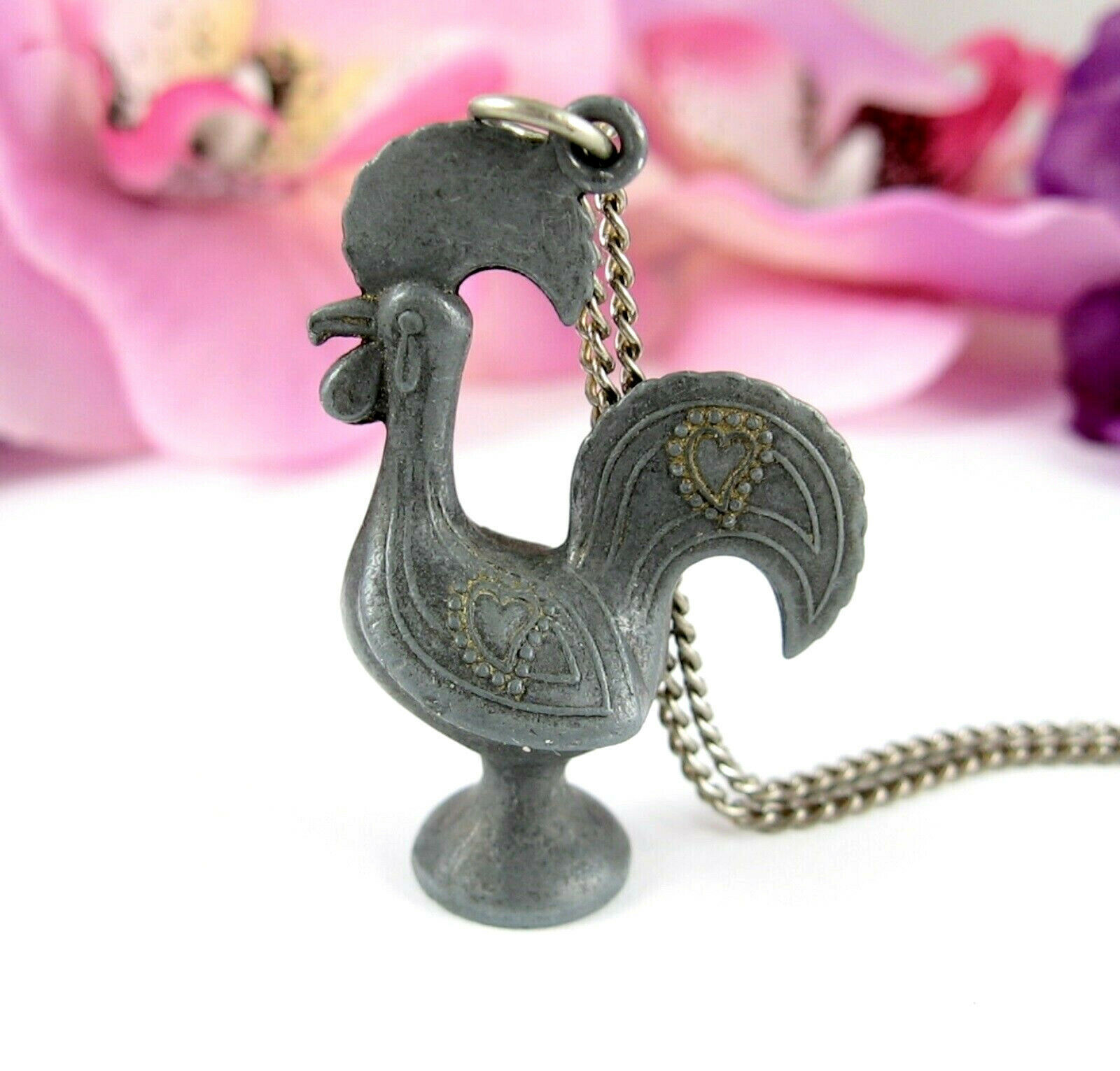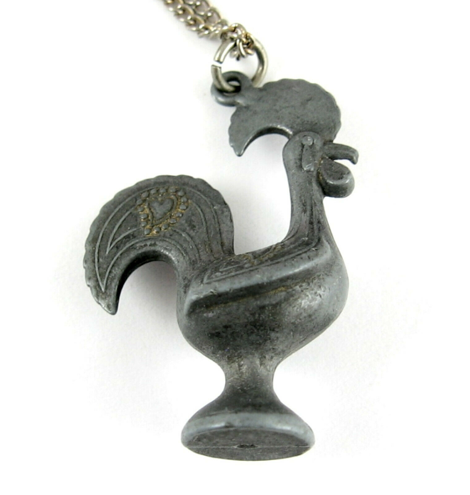 ROOSTER Dark Silvertone Cast Metal PENDANT Vintage NECKLACE Country Heart Chick