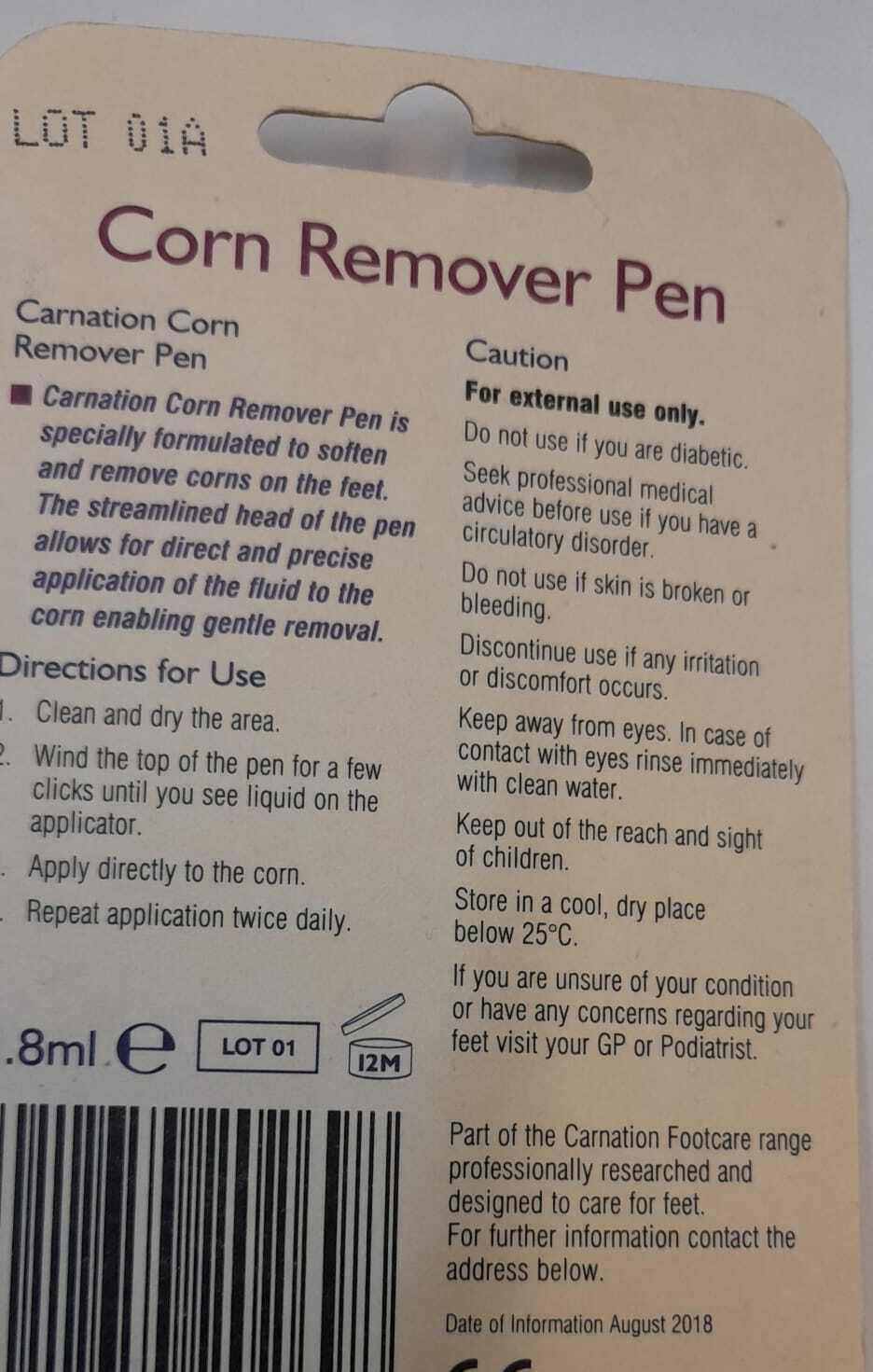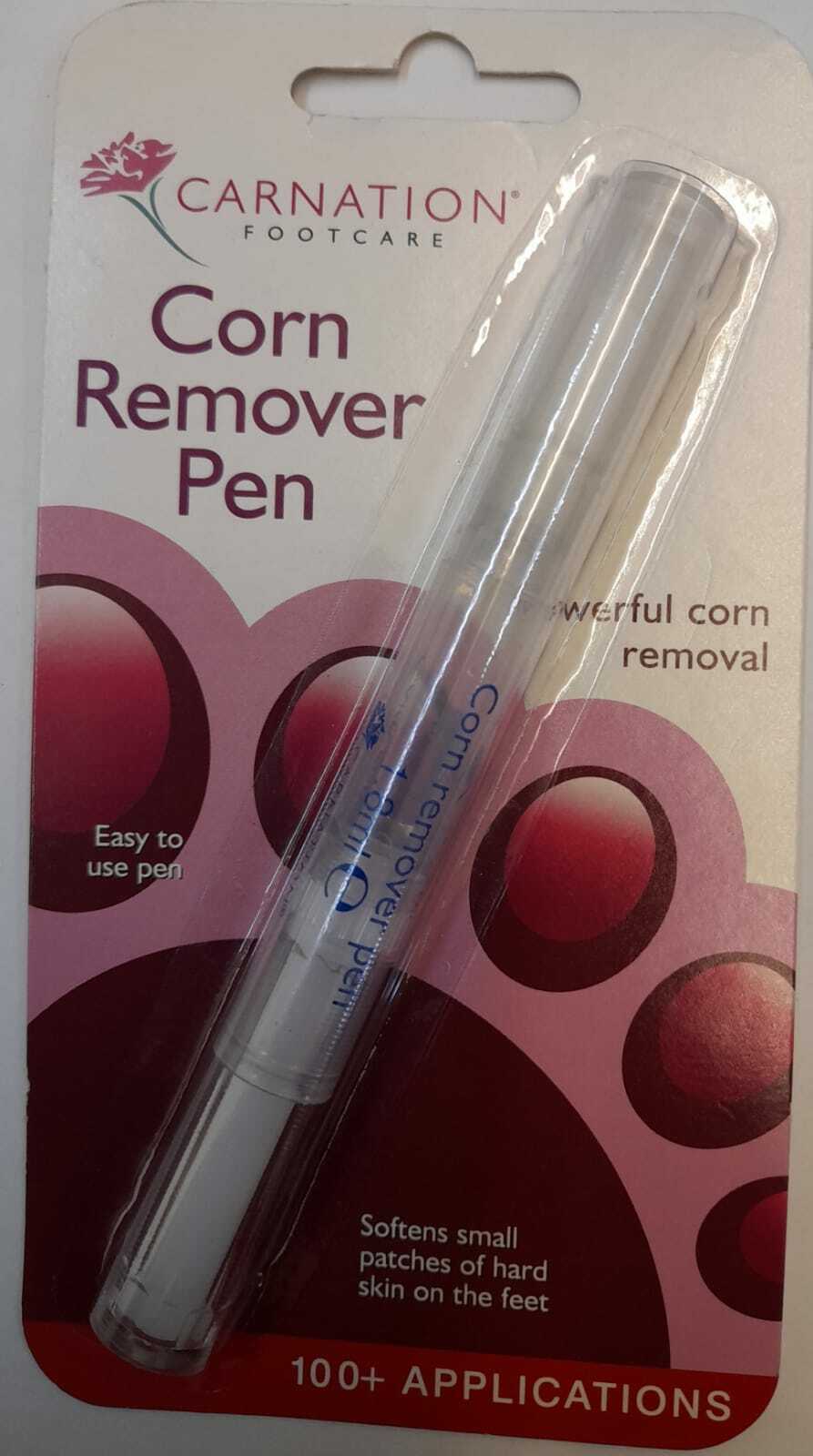 Carnation Footcare Corn Remover Pen is specially formulated to soften and remove corns on the feet. The streamlined head of the pen allows for direct and precise application to the area to be treated. Softens small patches of tough, hard skin on the feet, such as corns. Easy to use pen. With proven glycolic acid which can easily penetrate the built-up damaged, dead skin of calluses to “dissolve” the dead skin cells that cause this thickened layer of skin.