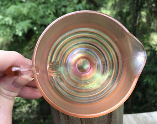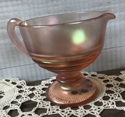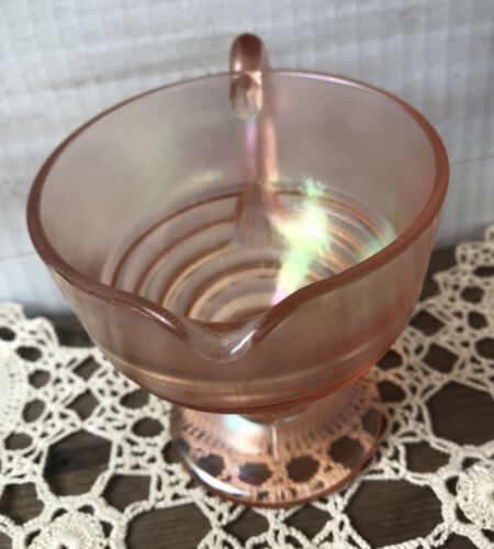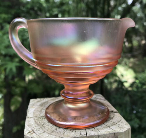 Hard to find, Beautiful! Vintage Dugan? Ribbed Carnival Glass Peach Opalescent Creamer Pedestal appears fused 2 seams. Measures approx. 3 1/2" Hgt. x 3 1/2" diameter mouth opening + additional 1" curved "C" Handle.