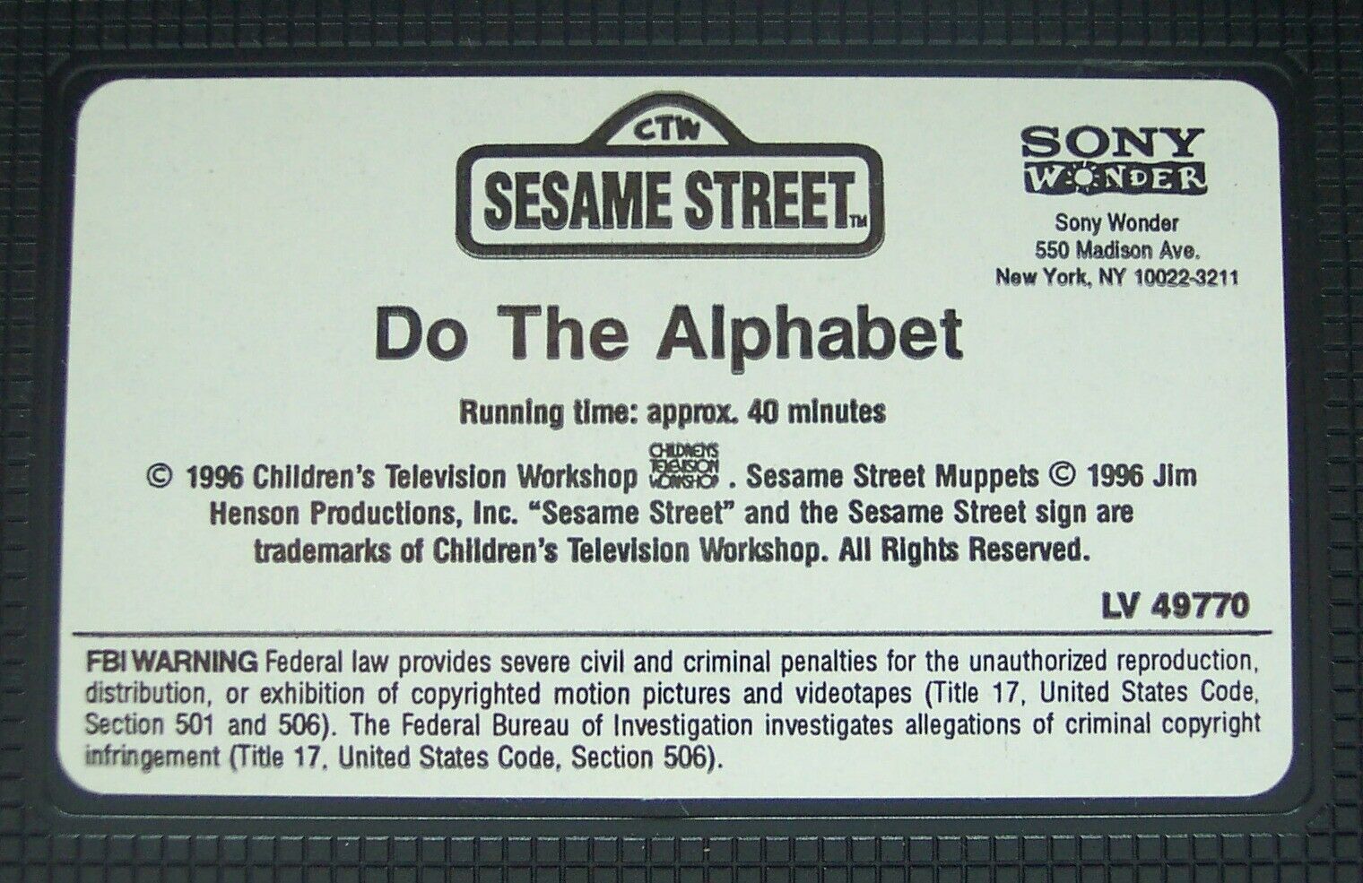 This is a Sesame Street DO THE ALPHABET VHS VIDEO from 1996. It has a run time 45 minutes. It is in great condition. Box has minor wear from use, but nothing major. Combine auctions to save on shipping. EAG