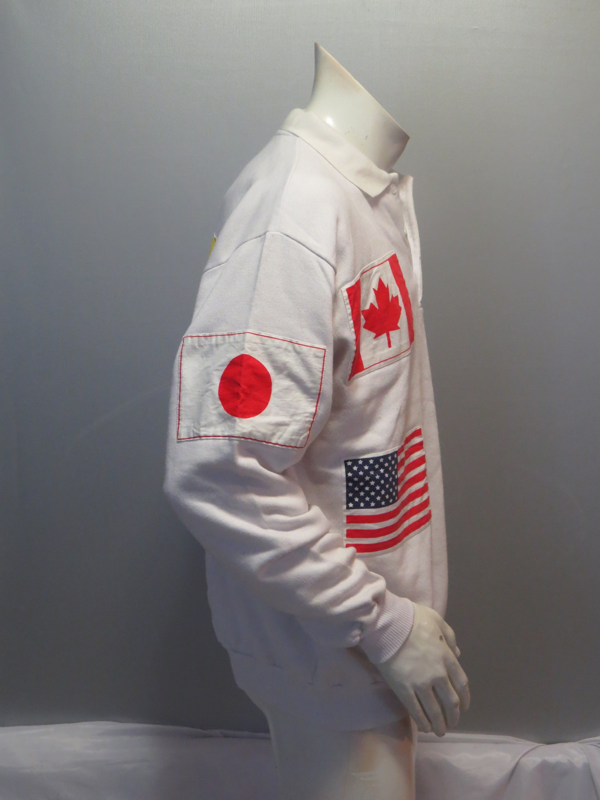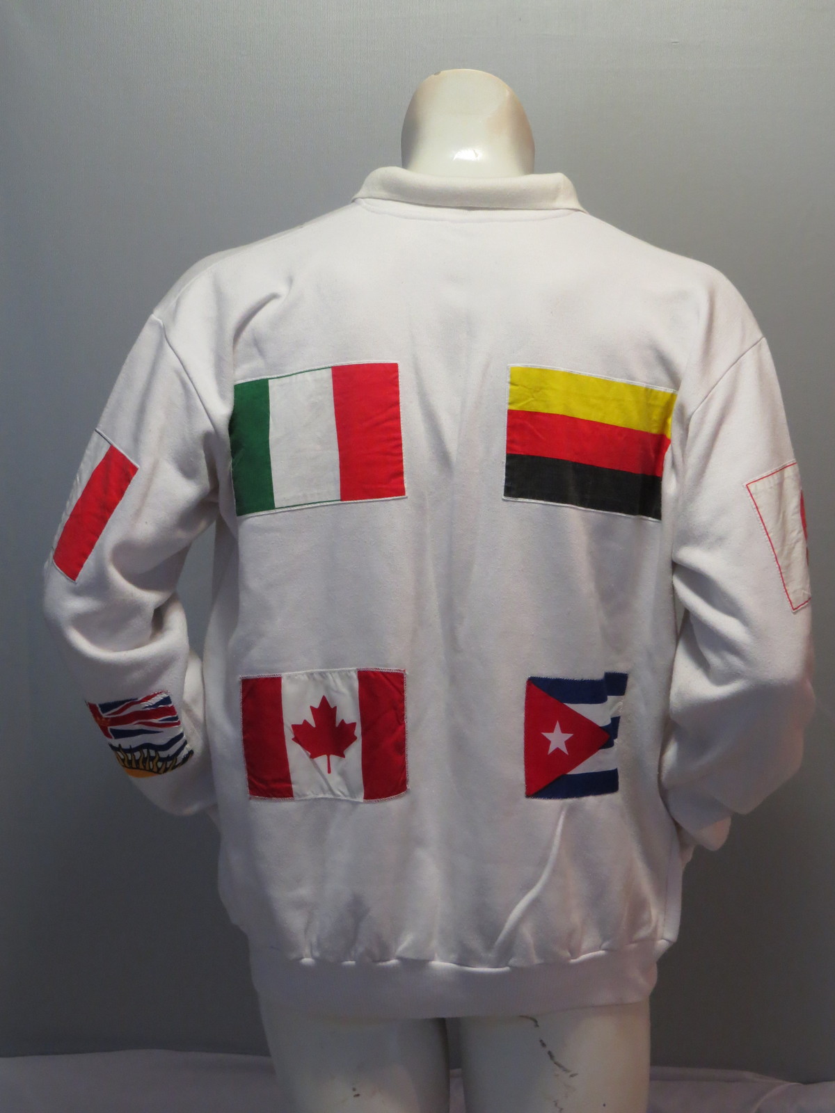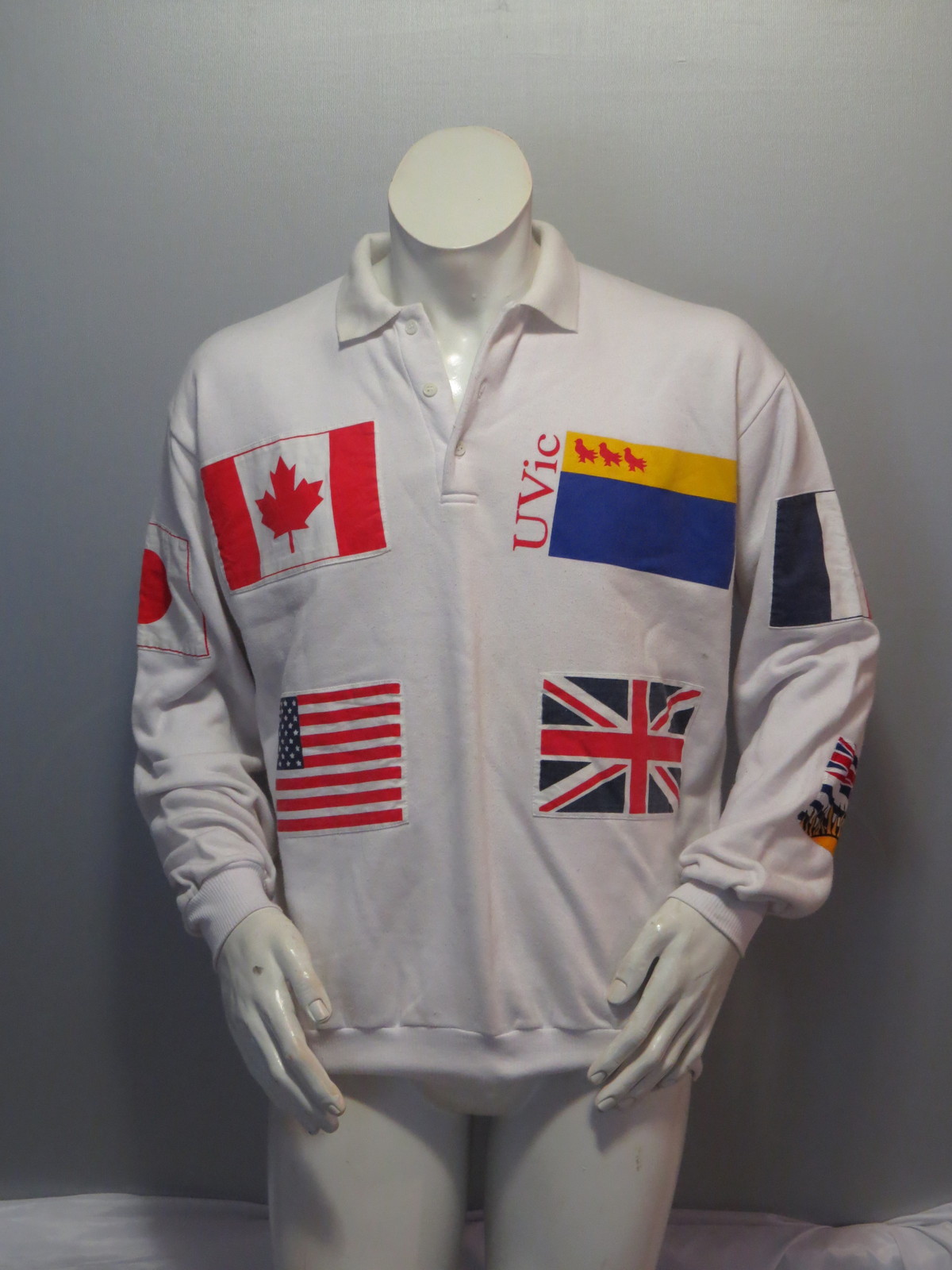 Up for sale is a vintage University of Victoria sweater. It has a white base colour and it is a flag patch special. The front of the sweater has the University of Victoria, Canadian, British and American flags patched on. One arm has British Columbia and French flags patched on while the other arm has the Japanese flag patched on. The back of the shirt has the German, Italian, Cuban and Canadian flags patched on. What a great vintage sweater do not miss out on it.