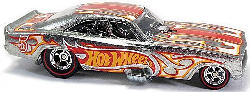 Description: ZAMAC w/Chrome interior; Clear windows; ‘Hot Wheels’ logo on sides; Red, Orange White flames on sides, hood, roof, trunk; Red stripe on top; Black grille tampo'd taillights; Real rider tires; Metal/Metal; Unpainted Malaysia base w/Chr5DWRL’s. Includes Kar Keeper Protective Clamshell Case. 041522-041522P-D29