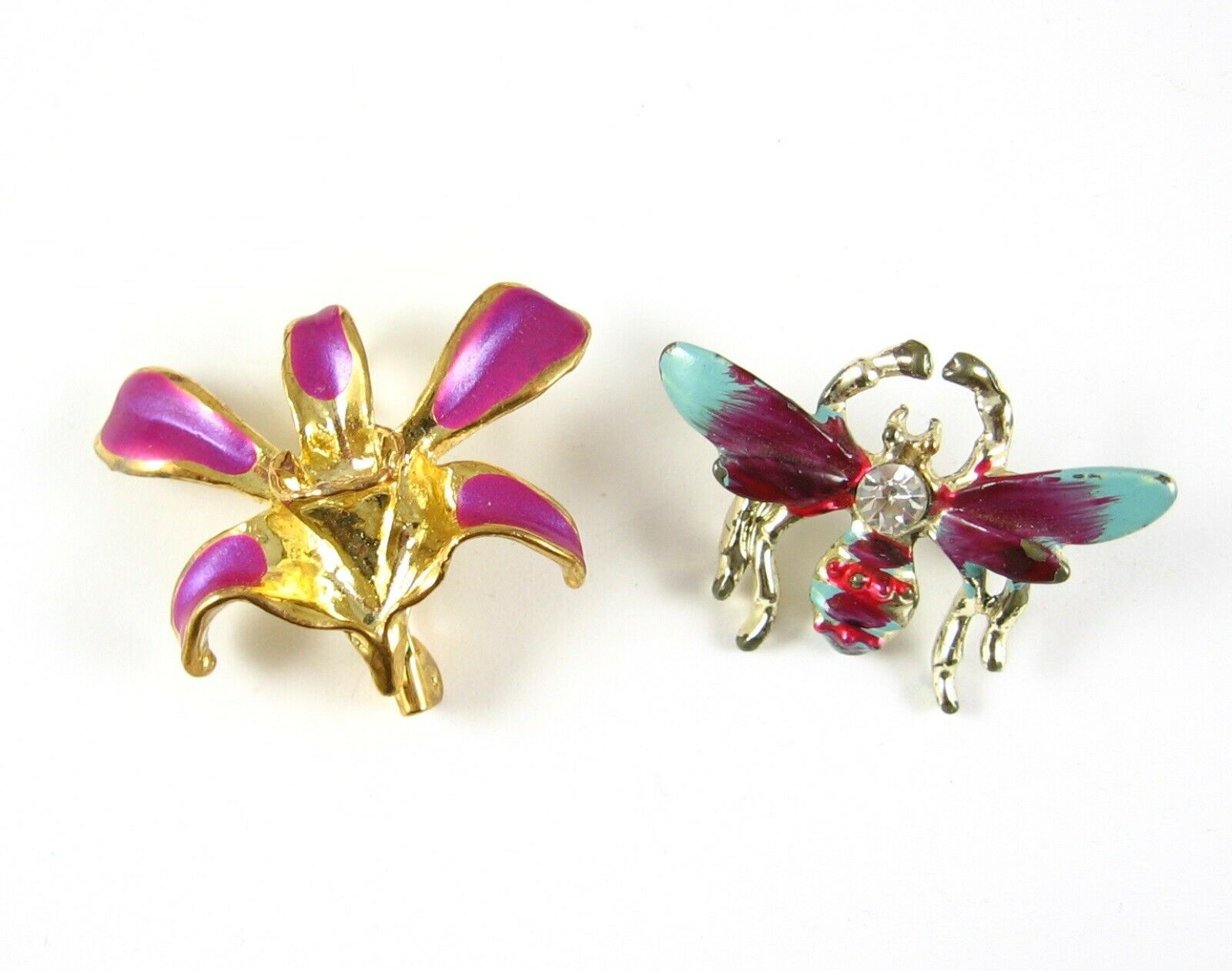 Both are decorated with enamels. The iris flower bloom is decorated in purple enamel. The bee or bug pin is decorated in purple, pink and light blue enamels.